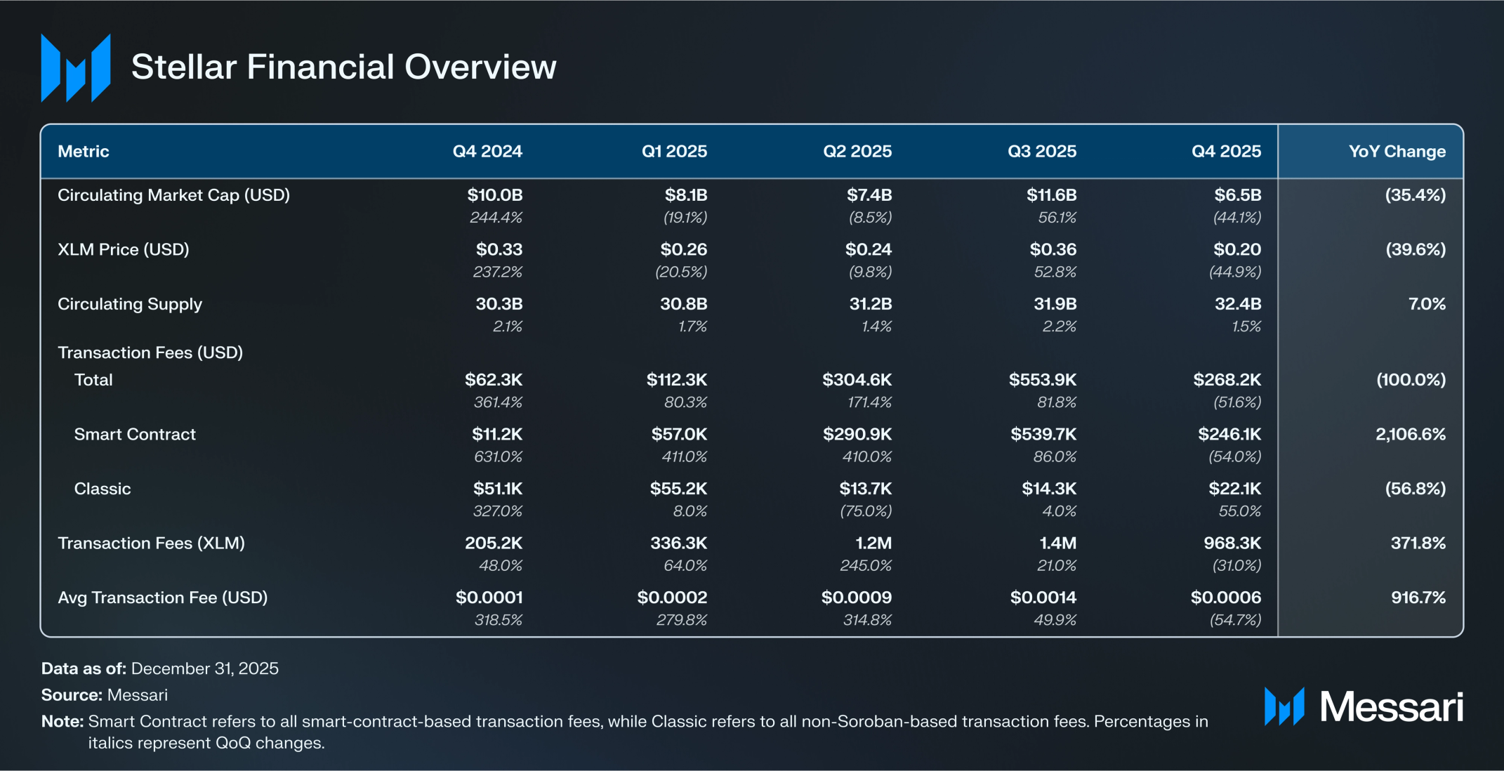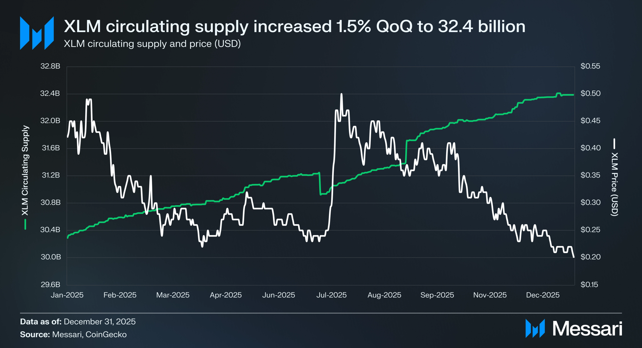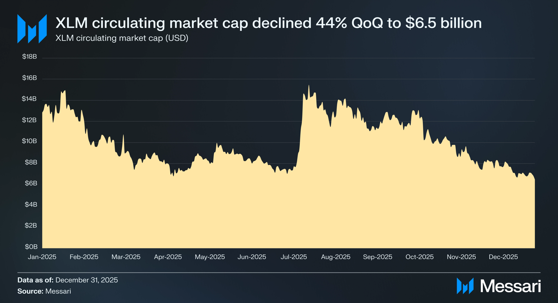 XLM은 2025년 4분기를 64억 9,000만 달러(분기 대비 -44.1%)의 시가총액으로 암호화폐 자산 17위로 마감하며, 분기 대비 24.4% 감소한 BTC, ETH, SOL 합산 시가총액을 하회했다. XLM 가격은 분기 대비 44.9% 하락하여 0.36 달러에서 0.20 달러로 내려갔으며, 시가총액과 가격 간 0.8%의 차이는 유통 공급량이 분기 대비 1.5% 증가한 324억 XLM에 기인한다. 전년 대비(YoY) 기준으로 XLM의 유통 시가총액은 2024년 4분기 말의 100억 5,000만 달러에서 35.4% 감소했다.