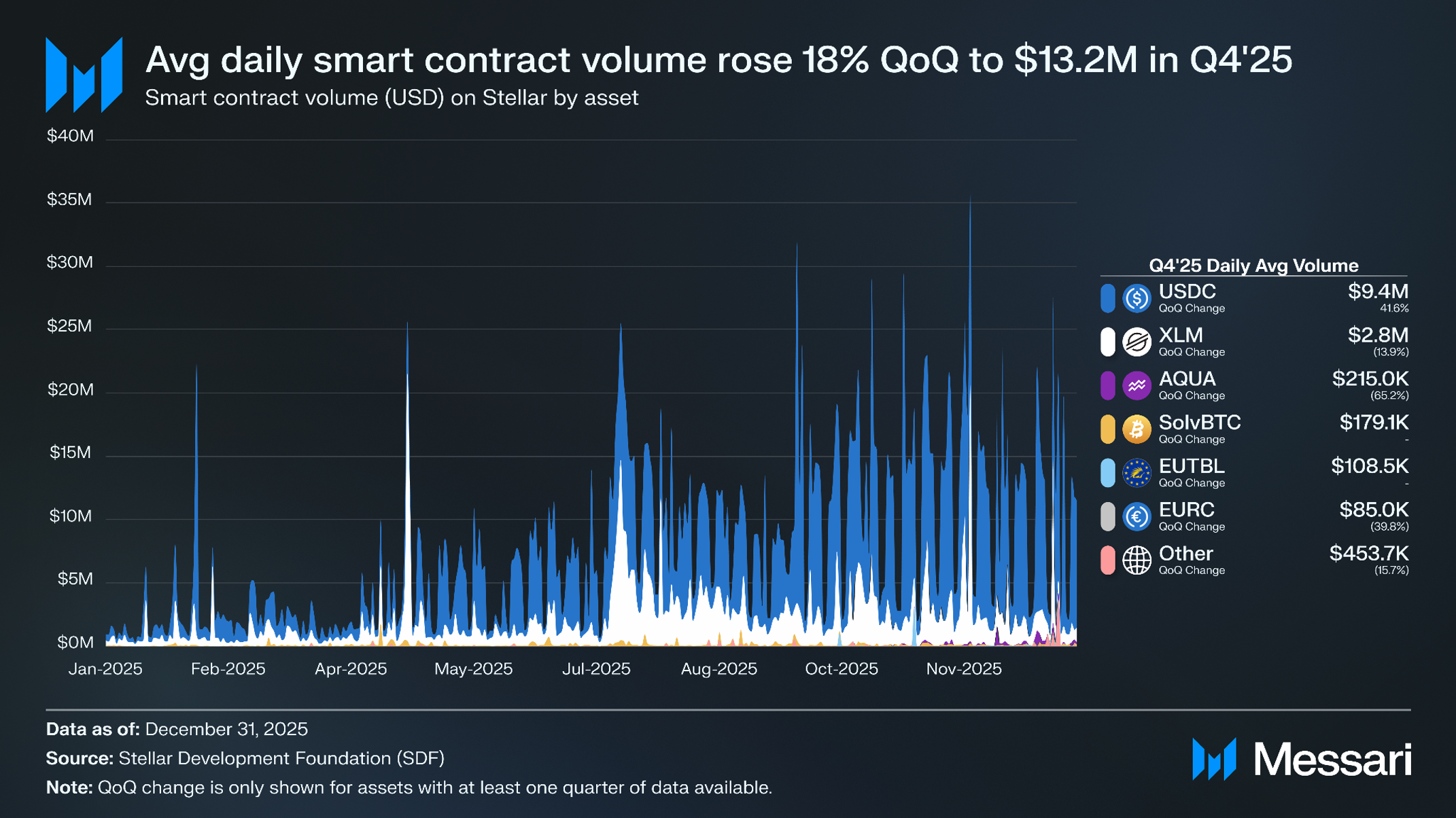 SDF는 스마트 컨트랙트 거래량을 토큰 이동(결제, 이전, 예치, 대출 등)을 유발하는 모든 스마트 컨트랙트 호출로 정의한다. 일평균 스마트 컨트랙트 거래량은 2025년 4분기에 분기 대비 18% 증가하여 1,120만 달러에서 1,320만 달러로 상승했다. 소로스왑과 아쿠아리우스가 거래량 기준 상위 DEX이며 피닉스(Phoenix)가 그 뒤를 따르고, 블렌드는 선도적인 초과 담보 대출 및 차입 프로토콜이다. 스텔라의 스마트 컨트랙트는 2025년 4분기 일평균 940만 달러의 USDC 거래량(분기 대비 +42%)을 기록했으며, 그 뒤를 280만 달러의 XLM(분기 대비 -14%), 21만 5,000 달러의 AQUA(분기 대비 -65.2%), 17만 9,100 달러의 솔브BTC(SolvBTC), 10만 8,500 달러의 EUTBL, 8만 4,960 달러의 EURC가 이었다.