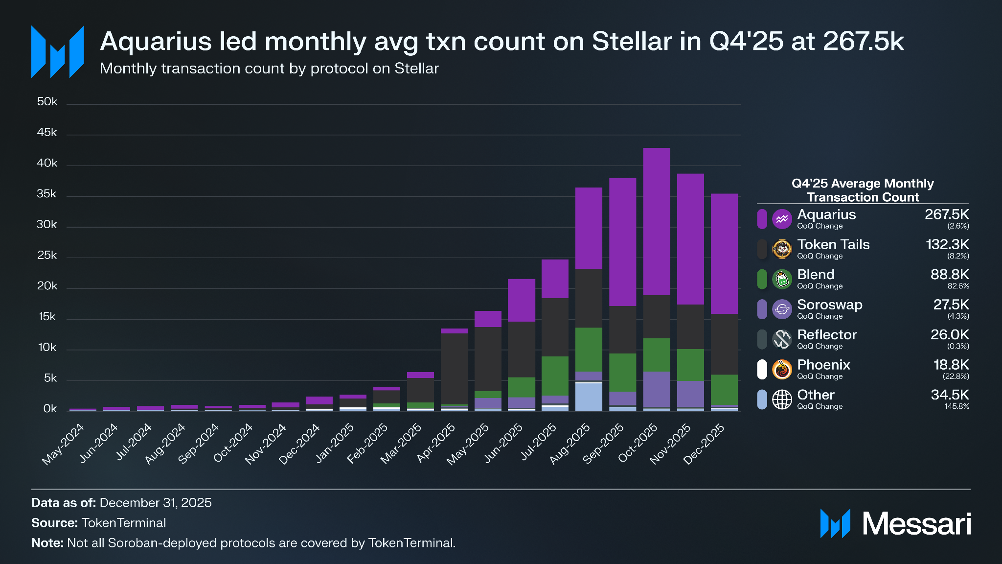 아쿠아리우스가 2025년 4분기 월평균 26만 7,460건의 트랜잭션(분기 대비 -3%)으로 전체 프로토콜 중 1위를 차지했으며, 토큰 테일즈 13만 2,320건(분기 대비 -8%), 블렌드 8,830건(분기 대비 +83%), 소로스왑 2만 7,510건(분기 대비 -4%)이 그 뒤를 이었다.