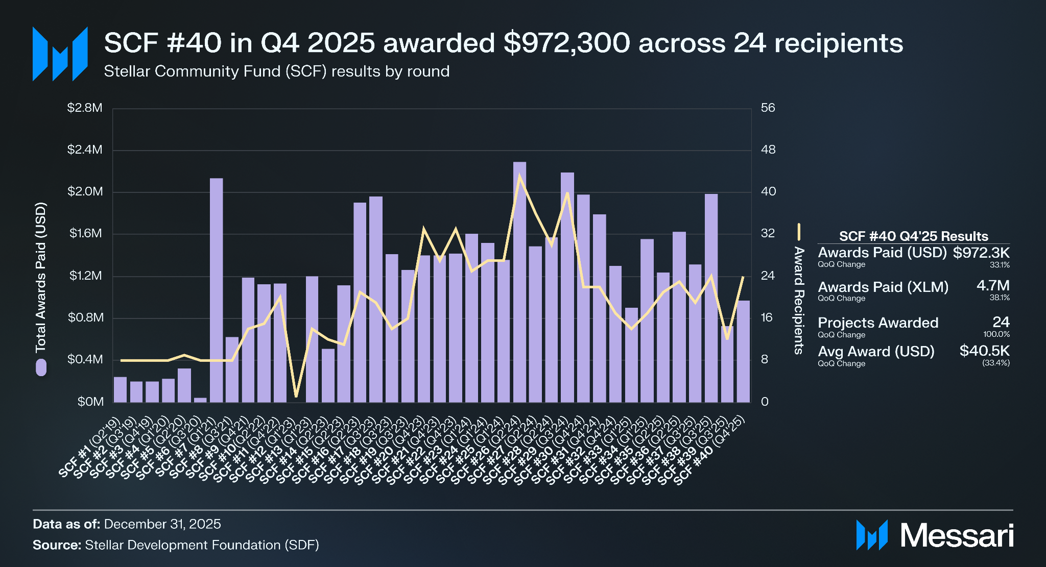 SCF 40회차는 2025년 12월 완료됐으며, 24개 수혜자에게 현재까지 97만 2,300 달러를 지급하여 총 220만 달러가 수여됐다. 기타 SDF 보조금 및 자금 지원 프로그램으로는 버그 바운티(bug bounty) 프로그램, SDF가 스텔라 네트워크 구축에 관심 있는 프리시드(Pre-seed)~시리즈 B 기업에 최대 50만 달러를 매칭 투자하는 매칭 펀드, 학술 연구 보조금, 스텔라 기반 프로젝트를 위한 마케팅 보조금이 있다.