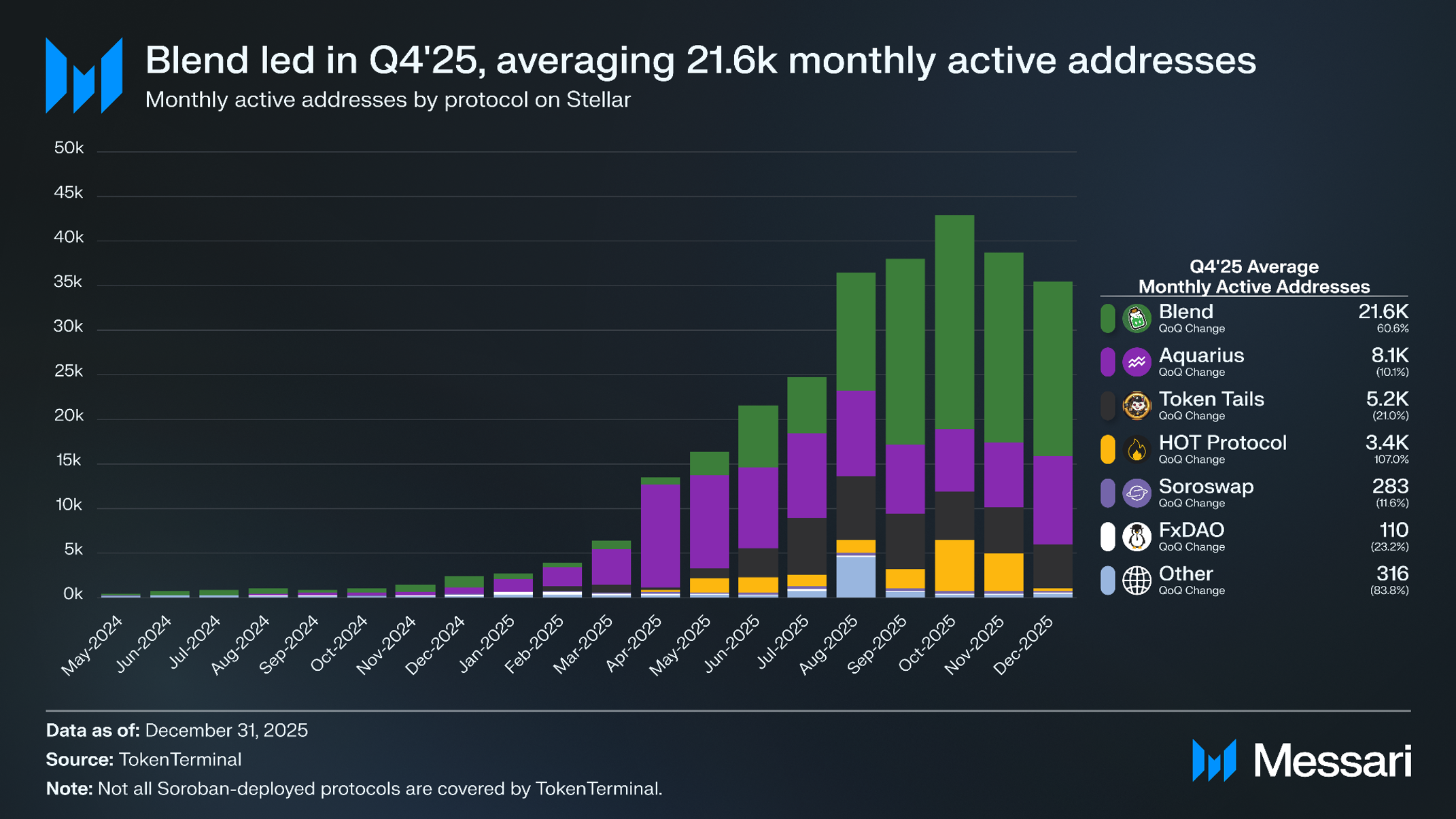 블렌드가 2025년 4분기 월평균 2만 1,580개의 활성 주소(분기 대비 +61%)로 전체 프로토콜 중 1위를 차지했으며, 아쿠아리우스 8,080개(분기 대비 -10%), 플레이 투 세이브(play-to-save) 가상 고양이 입양 게임 토큰 테일즈(Token Tails) 5,160개(분기 대비 -21%), 탈중앙화 MPC 지갑 제공업체 핫 프로토콜(HOT Protocol) 3,420개(분기 대비 +107%)가 그 뒤를 이었다.