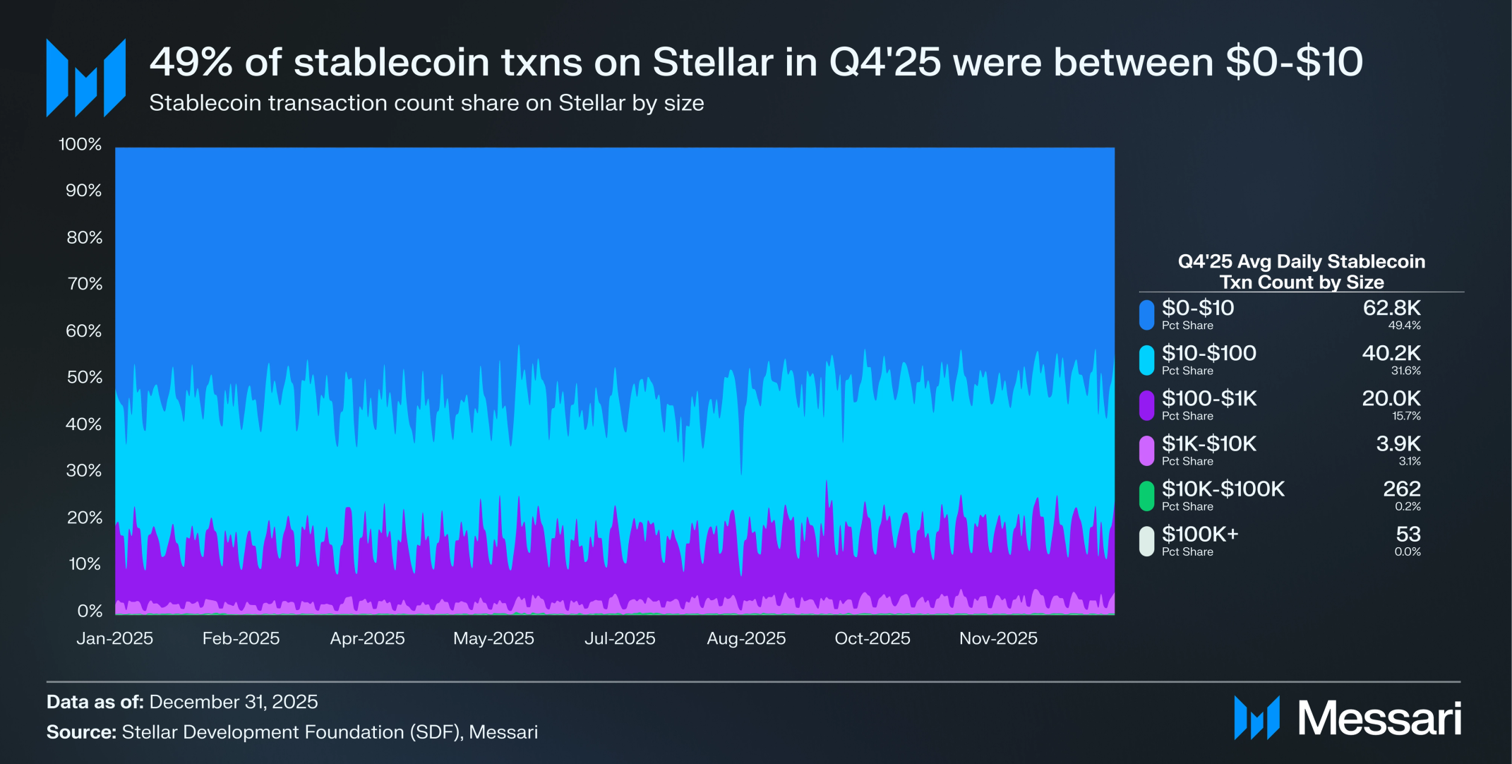 2025년 4분기 스테이블코인 트랜잭션의 49.4%는 0~10 달러 구간이었으며, 10~100 달러 구간이 31.6%, 100~1,000 달러 구간이 15.7%, 1,000~1만 달러 구간이 3.1%, 1만~10만 달러 구간이 0.2%였다. 주목할 점은, 0~10 달러 구간의 일평균 스테이블코인 트랜잭션이 분기 대비 7.6% 감소하여 6만 8,010건에서 6만 2,820건으로 줄어든 반면, 10~100 달러 구간은 분기 대비 6.9% 증가하여 3만 7,650건에서 4만 230건으로 늘어나며 더 높은 결제 규모에서의 트랜잭션 활동이 증가했음을 보여준다.