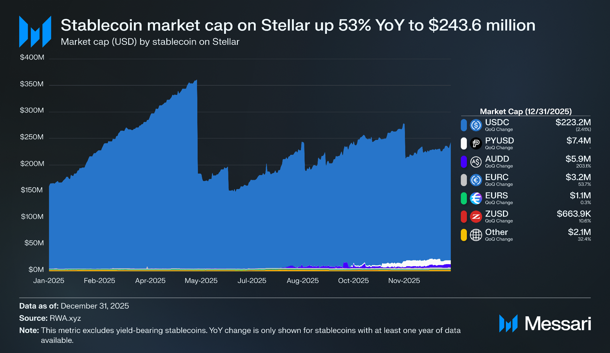 • 스텔라의 스테이블코인 시가총액은 2025년 9월 네트워크에 출시된 페이팔의 PYUSD와 USDC의 전년 대비 45% 시가총액 증가(2억 2,300만 달러)에 힘입어 전년 대비 53% 증가한 2억 4,400만 달러를 기록했다.