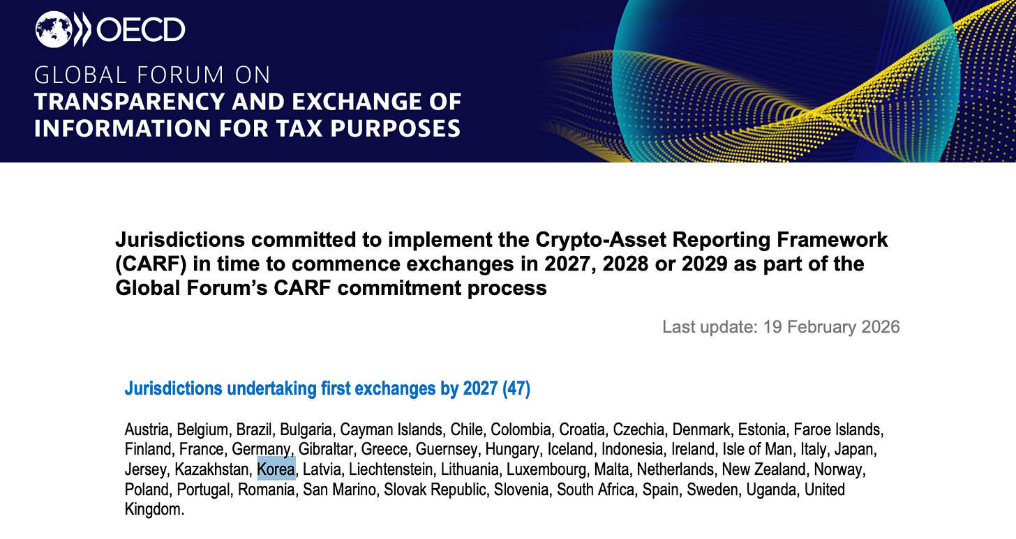 국제적으로도 같은 방향이다. OECD 문서에 따르면 한국은 가상자산 자동정보교환체계인 CARF 의 첫 교환을 2027년에 시작하겠다고 약속한 국가군에 포함돼 있다. CARF는 쉽게 말해 국가 간 가상자산 세무정보를 자동으로 주고받는 국제 기준이다.