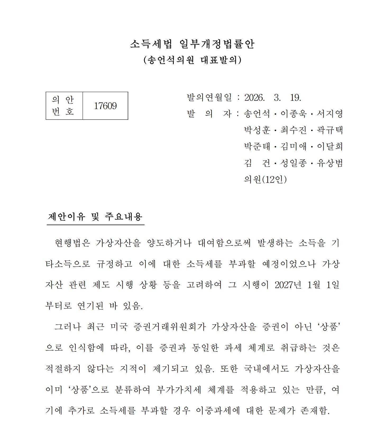 첫째는 형평성이다. 송언석 의원이 3월 19일 발의한 소득세법 개정안의 제안이유에는 금융투자소득세가 폐지된 상황에서 가상자산에만 별도로 소득세를 부과하는 것이 과세 체계의 형평성과 일관성에 맞지 않는다는 논리가 담겼다. 3월 25일 국민의힘과 거래소 간담회에서도 같은 논리가 반복됐다.