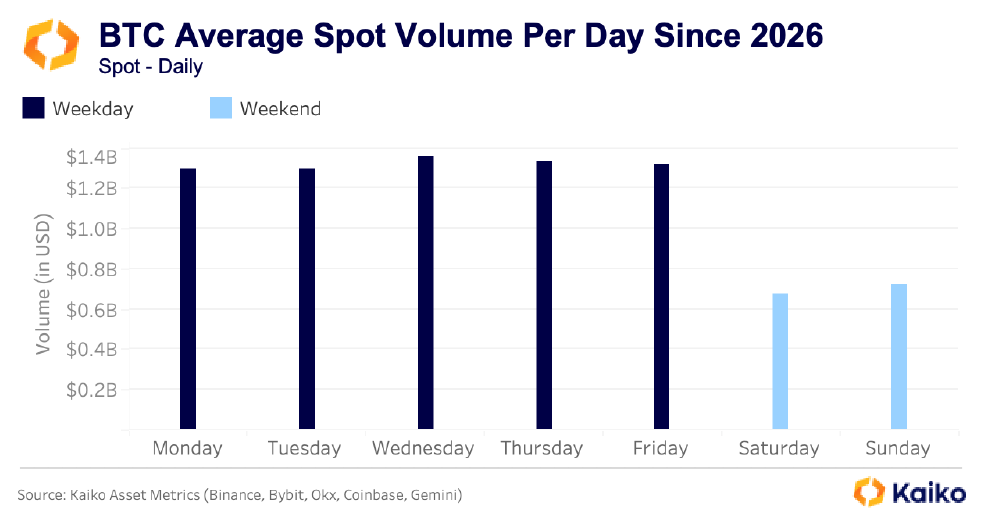 데이터에 따르면 평일 거래량은 주말 대비 일관되게 100% 높은 수준을 기록하며, 기관 자금 배분이 확대된 2025년을 거치면서 이 활동 격차는 더욱 심화됐다.