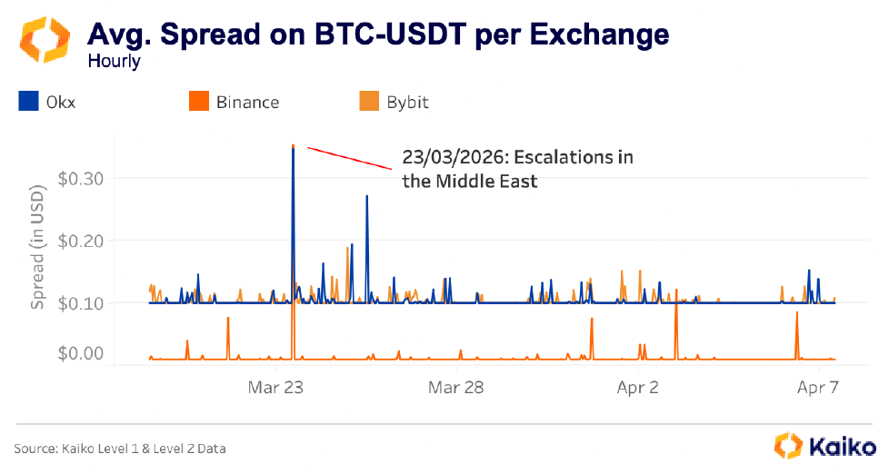이러한 이벤트가 발생하는 동안 거래소 전반에서 오더북 깊이가 악화되면서, 매수·매도 스프레드 역시 동반 확대됐다. 3월 지정학적 긴장 기간에도 동일한 패턴이 반복되었는데, BTC-USDT 스프레드가 거래소 전반에 걸쳐 평균 수준 대비 3배까지 확대되어 가격 차이 외에도 체결 비용을 복합적으로 가중시키며 전반적인 시장 품질을 저하시켰다.