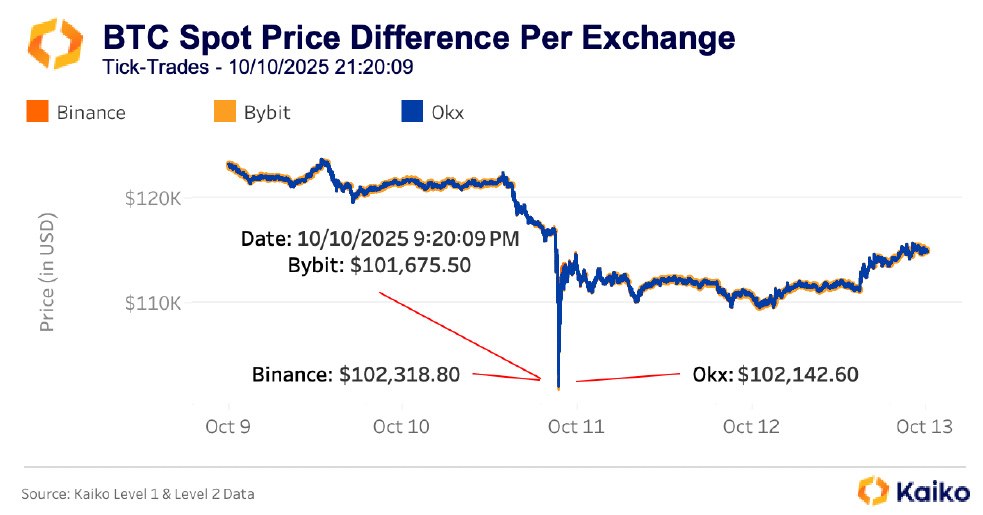 10월 10일 관세 갈등 고조 사태는 스트레스 국면에서 이 분절화가 어떻게 증폭되는지를 적나라하게 드러냈다. UTC 기준 21시 20분, 변동성이 확대되면서 BTC 현물 가격이 거래소 간에 크게 벌어졌다. 바이낸스는 10만 2,318 달러, OKX는 10만 2,142 달러를 호가한 반면, 바이빗은 10만 1,675 달러에 그쳐 63 베이시스 포인트에 해당하는 643 달러의 스프레드가 발생했다. 이 격차는 수 초가 아닌 수 분간 지속되었는데, 이는 변동성이 급등했을 때 차익거래 메커니즘이 가격 차이를 효율적으로 좁히지 못했음을 시사한다.