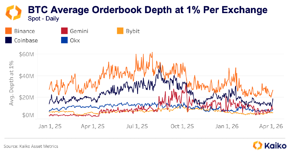 이러한 분절화는 시장 사이클 전반에 걸쳐 안정적으로 유지됐다. 비트코인이 10만 달러를 상회하다가 조정을 받았던 2025년 1월과 2026년 1월 모두, 깊이 집중 패턴은 변함없이 유지됐다. 바이낸스와 코인베이스는 변동성 국면에 무관하게 시장 지배력을 지켰다.
