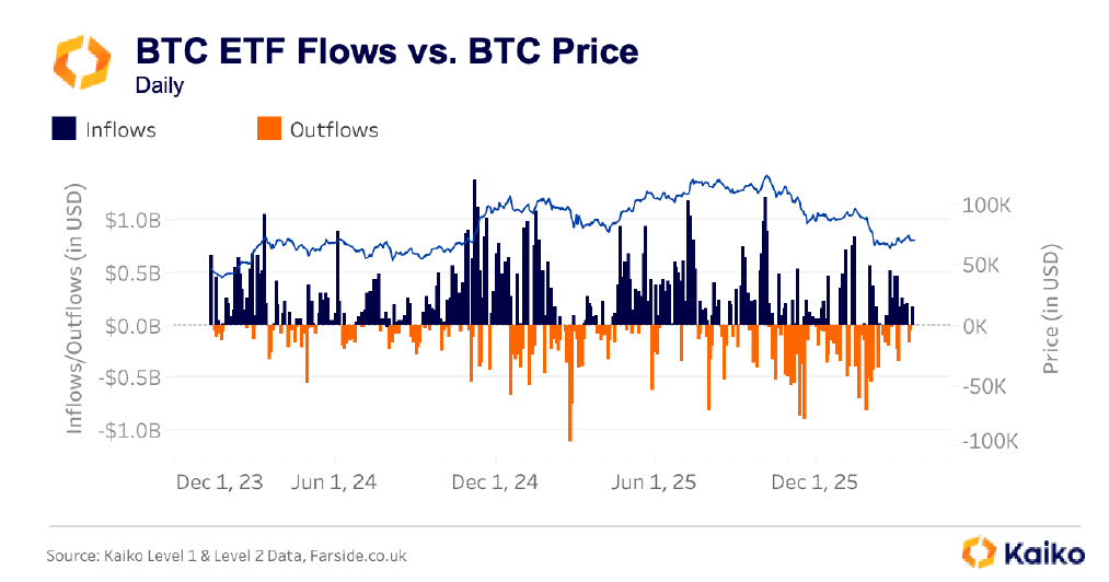 • ETF 자금 흐름이 일일 BTC 가격 변동과 직접적인 상관관계를 보이며, 새로운 기관 심리 지표로 자리잡음