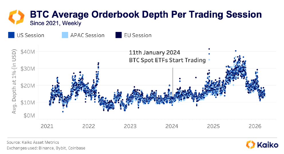 2024년 1월 11일 ETF 출시는 변곡점이 됐다. 모든 거래 세션에 걸쳐 즉각적으로 깊이가 증가하기 시작하여 2024년 3월 2천만 달러에 도달했으며, 2025년 내내 2천 500만~3천 500만 달러 수준을 유지했다. 특히 활발한 기간에는 깊이가 4천만 달러를 상회하며 2021~2023년 기준선의 두 배 이상을 기록했다. 이 개선은 미국, APAC, EU 세션 전반에 걸쳐 균일하게 나타났으며, 이는 시간대별 효과가 아닌 시스템 차원의 인프라 변화를 시사한다.