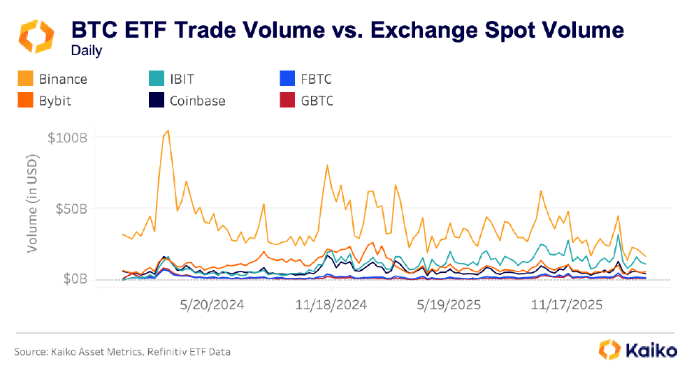 아울러 일일 ETF 거래량은 코인베이스 현물 거래량과 정기적으로 맞먹거나 이를 초과한다. 2025년 전반에 걸쳐 IBIT 거래량은 평상시 160억~180억 달러 범위를 유지했으며, 변동성이 큰 시기에는 250억 달러를 상회하며 바이낸스 현물 활동에 근접했다. 역사적으로 미국의 지배적인 거래소였던 코인베이스 현물 거래량은 60억~80억 달러 범위에서 거래되어 FBTC와 GBTC 각각을 상회하지만, 합산 ETF 거래량에는 크게 미치지 못한다.