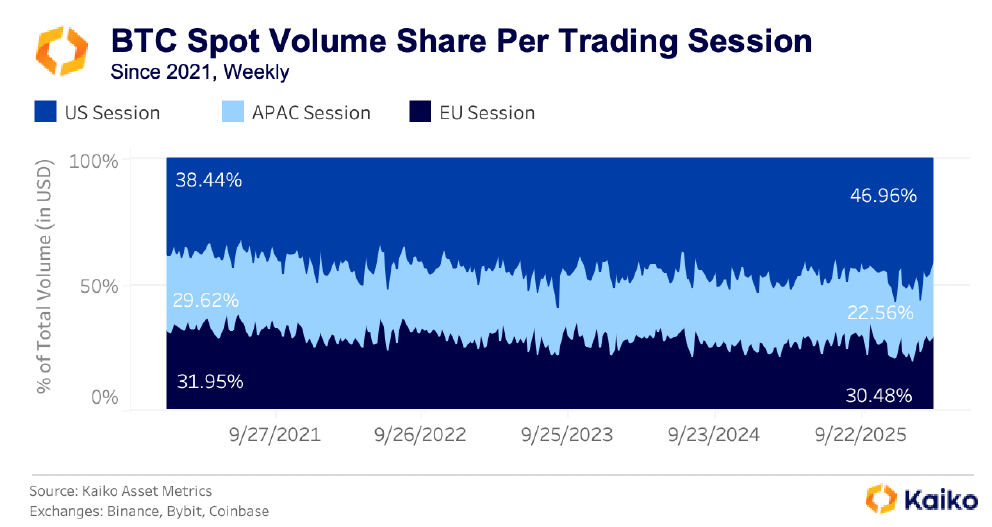 • 미국 거래 시간대가 전 세계 BTC 현물 거래량의 47%를 차지하며, ETF 도입 이전의 38%에서 상승