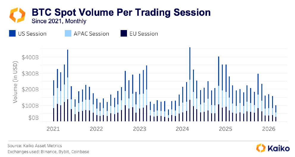 ETF 출시는 2024년 1월 11일 현물 ETF 거래가 시작된 이후 이 균형을 근본적으로 변화시켰는데, 미국 세션 거래량 비중이 38%에서 2026년 초 46.96%로 꾸준히 상승했다. APAC의 비중은 29.62%에서 22.56%로 압축됐고, 유럽 세션은 31.95%에서 약 30.48%로 하락했다. 이 전환은 바이낸스, 바이빗, 코인베이스 현물 시장에서만 미국 거래 시간대를 향한 월 500억 달러 이상의 거래량 재편을 의미한다.