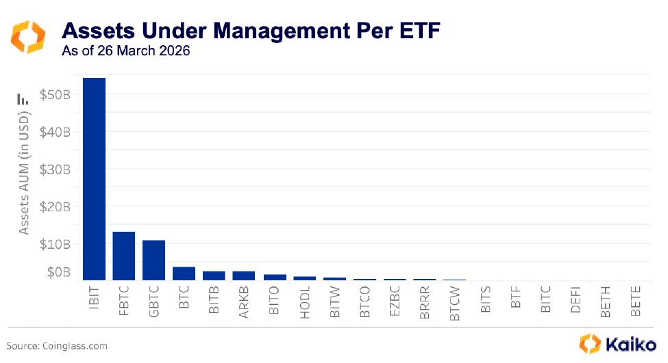 블랙록의 IBIT는 현재 운용 자산 500억 달러를 기록하며 역사상 가장 빠르게 성장한 ETF이자 가장 지배적인 BTC 현물 상품이 됐다. 피델리티(Fidelity)의 FBTC는 약 128억 달러를, 그레이스케일(Grayscale)의 전환된 GBTC는 2024년 전반에 걸친 대규모 자금 유출에도 불구하고 약 108억 달러 수준에서 안정화됐다. 상위 3개 BTC ETF를 합산하면 730억 달러 이상을 운용하며, 이는 전체 BTC ETF의 80.6%에 해당한다.