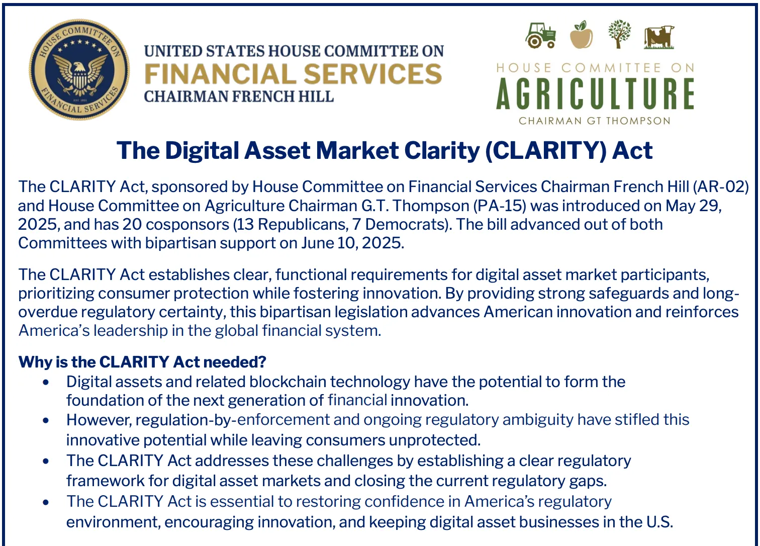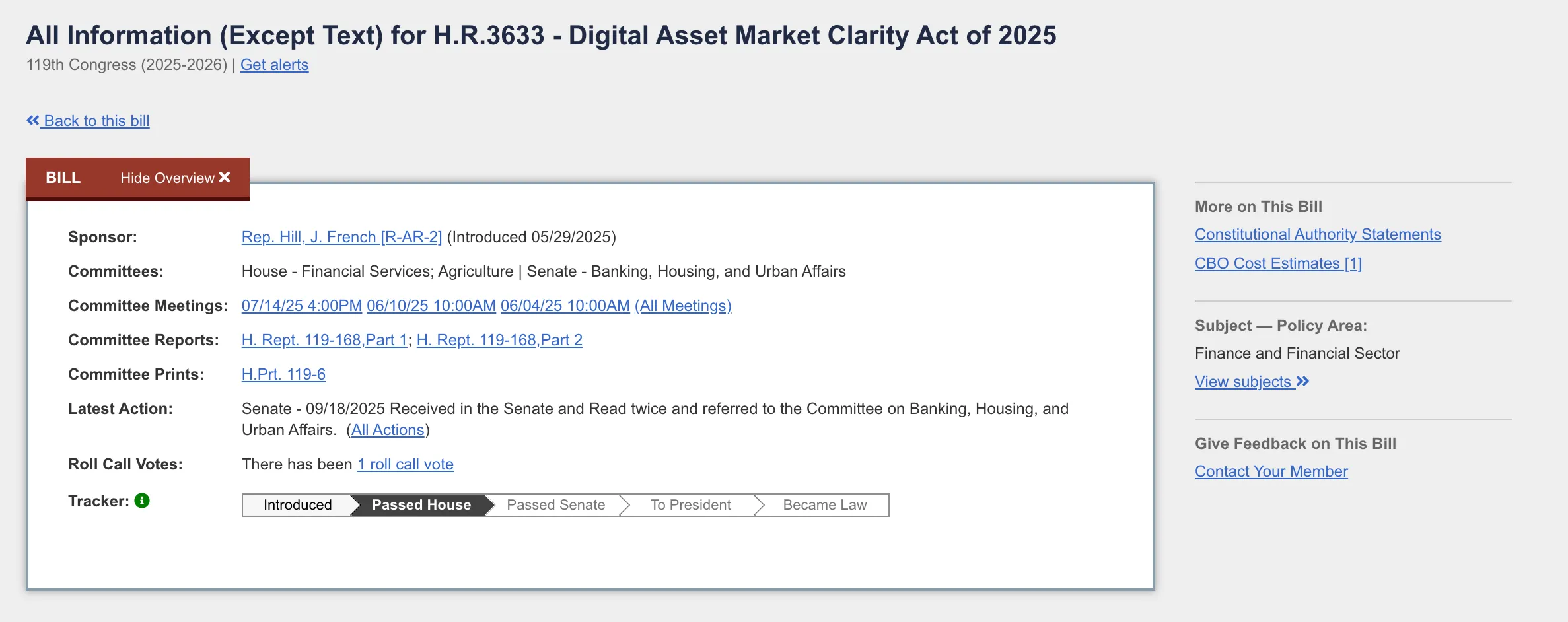2026년 4월 24일 현시점, CLARITY Act는 더 이상 가능성의 영역이 아니다. 하원은 이미 2025년 7월 17일 디지털 자산 시장 명확화 법안(CLARITY Act, Digital Asset Market Clarity Act of 2025, H.R.3633)을 294대 134로 통과시켰고, 이 법안은 2025년 9월 18일 상원에 넘어가 상원 은행위원회(Senate Banking, Housing, and Urban Affairs Committee)에 회부된 상태다. 즉, 하원 전선은 이미 끝났다. 지금 시장이 봐야 하는 것은 상원 전체가 아니라, 상원 은행위원회가 언제 병목을 해소하느냐다.