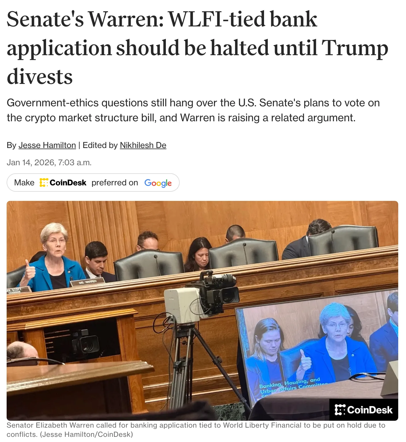 세 번째 병목은 윤리와 이해상충 문제다. 이 부분을 정치적 수사로만 보면 안 된다. 엘리자베스 워런(Elizabeth Warren) 상원 은행위 민주당 간사는 1월 초부터 트럼프 일가가 관여한 월드 리버티 파이낸셜(World Liberty Financial)의 은행 인가 신청과 시장구조 입법이 동시에 진행되는 점을 정면으로 문제 삼았다. 1월 13일에는 해당 회사의 은행 인가 검토를 트럼프가 완전히 이해관계에서 손을 떼기 전까지 중단해야 한다고 주장했고, 1월 23일에는 “이런 수준의 금융 이해상충을 본 적이 없으며, 이를 막는 안전장치 없이 어떤 크립토 시장구조 법안도 통과돼서는 안 된다”고 말했다. FT도 1월 7일 월드 리버티 파이낸셜의 미국 은행 라이선스 신청 사실을 보도했다. 이 이슈는 상징 문제가 아니다. 법안을 통과시키려면 필요한 바로 그 민주당 표가 여기에 민감하기 때문이다.