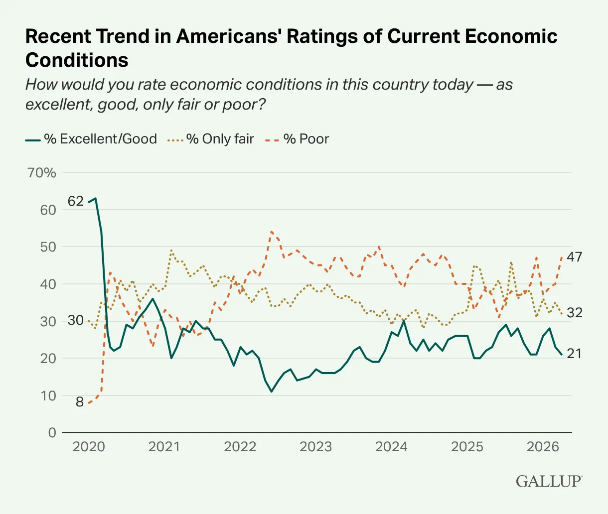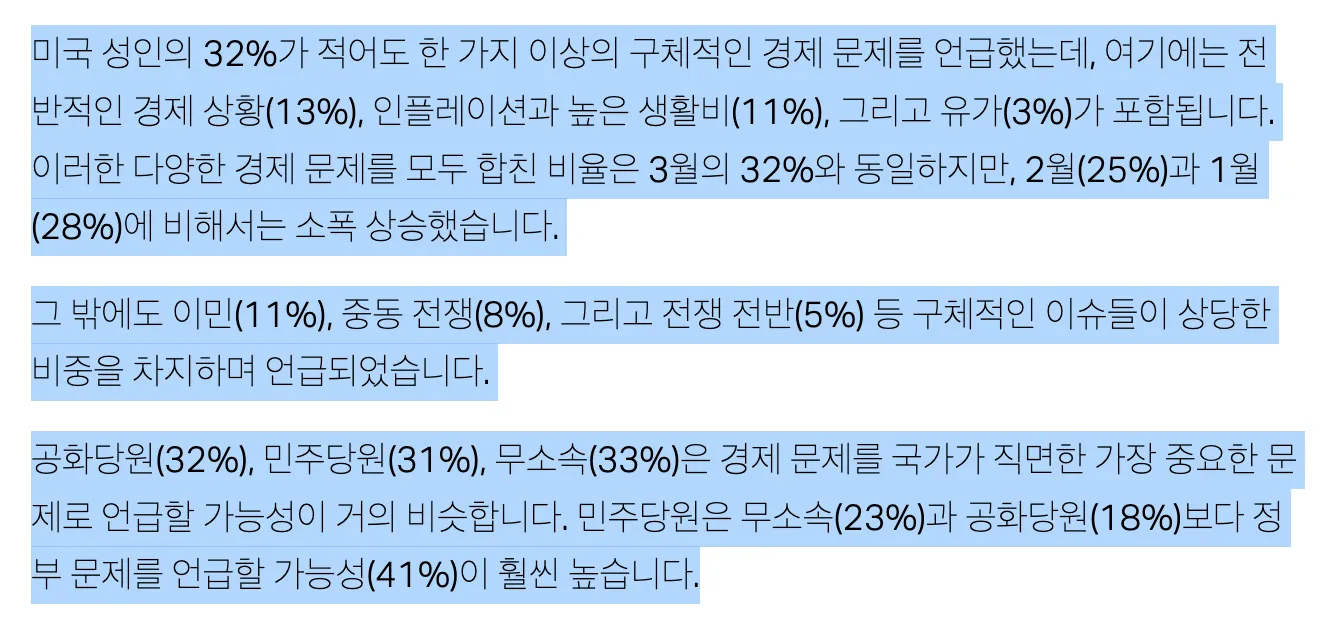 실제 민심이 어디에 쏠려 있는지는 다른 지표들이 더 잘 보여준다. Gallup의 4월 23일 조사에서는 미국인이 꼽은 가장 중요한 문제로 정부 운영, 경제 전반, 물가와 생활비, 이민, 중동 전쟁이 앞에 나왔다. 구체적으로 보면 경제 관련 이슈 전체 응답은 32%였고, 이민은 11%, 중동 전쟁은 8%였다. 같은 시기 AP-NORC 조사에서는 트럼프의 경제 운용 지지율이 30%까지 내려왔고, 전체 직무 지지율도 33% 수준이었다. Axios도 4월 미국인들이 체감하는 경제 비관론이 매우 강하다고 정리했다. 이 수치들은 2026년 중간선거의 중심 의제가 크립토 입법이 아니라 경제, 생활비, 에너지, 전쟁, 이민에 더 가깝다는 점을 보여준다.