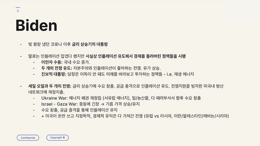 바이든 행정부는 이민자 수용 정책을 통해 국내 수요를 증가시키는 한편, 우크라이나 전쟁과 이스라엘·가자 분쟁 등 국제적 갈등 상황을 효과적으로 활용했습니다. 특히 바이든 행정부는 재생 에너지 등의 투자로 미래를 바라보는 투자를 진행하면서, 결과론적으로 인플레이션을 유도하고 미국의 실질적인 채무 부담을 경감시켰습니다. 이러한 정책들은 ‘미국’이라는 추상적인 개념을 기반으로 align되어 있다고 보입니다.