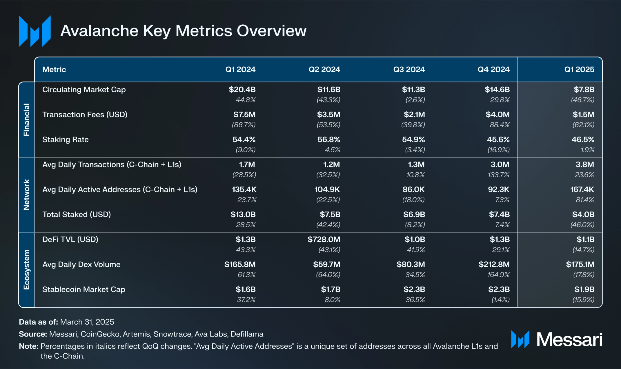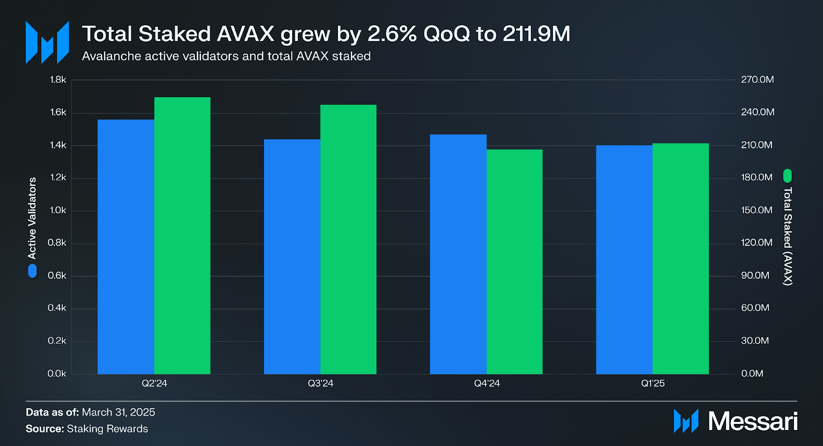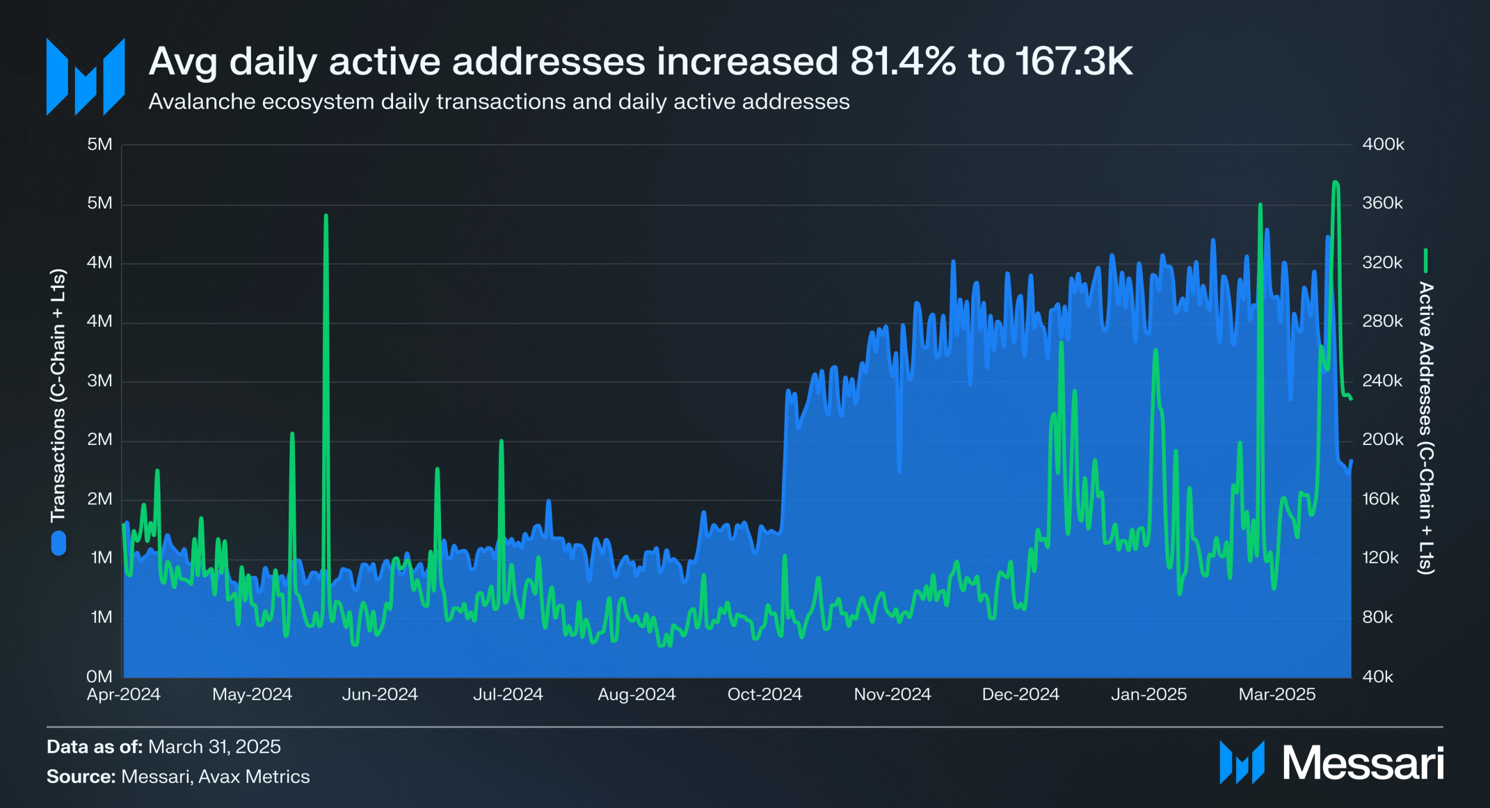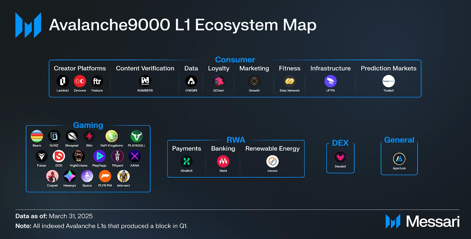 아발란체의 기업 및 게임 생태계는 계속해서 성장을 보였다. 2025년 1분기에 그로스, GUNZ, 트레이드X 같은 프로젝트를 포함해 8개의 새로운 아발란체 L1s이 출시됐다. 기업 채택 측면에서 아발란체는 와이오밍 스테이블 토큰 위원회에 의해 WYST 발행을 위해 선택됐고, 인도 단테와다 지역의 70만 개 이상의 디지털화된 토지 기록의 백본이 됐으며, 브라스 너클 필름스와 리퍼블릭을 통한 토큰화된 영화 파이낸싱을 가능하게 했다. 게임 측면에서 아발란체는 빔 노드와 워프체인의 출시로 인프라 성장을 보였으며, 펄사와 혼티드 스페이스 같은 게임 타이틀이 사용자 참여를 이끌었다.