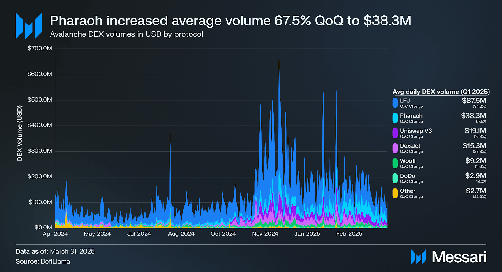 • 파라오(Pharaoh)는 일일 평균 거래량(USD)이 전분기 대비 67.5% 증가해 3830만 달러를 기록했다. 전체적으로 아발란체 C-체인의 일일 평균 DEX 거래량은 전분기 대비 17.8% 감소해 1억 7510만 달러를 기록했다.