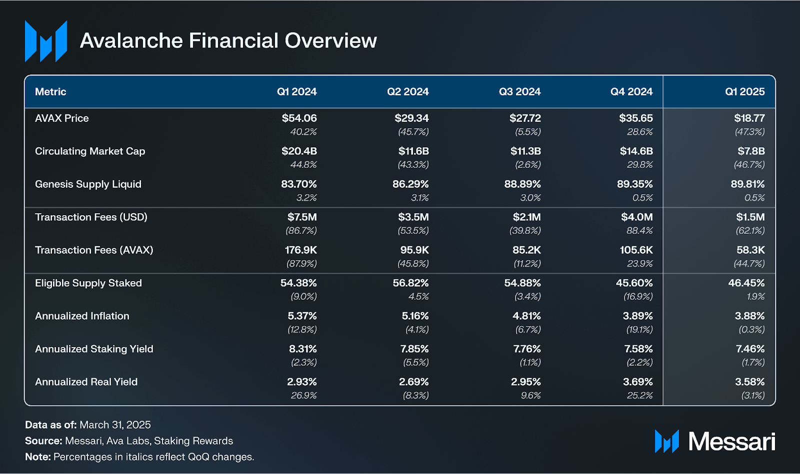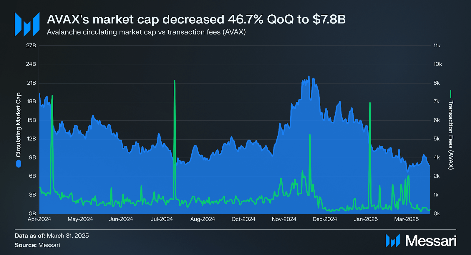 AVAX의 유통 시가총액은 전분기 대비 46.7% 감소해 78억 달러를 기록했다. 이로 인해 모든 토큰 중 유통 시가총액 순위가 11위에서 15위로 하락했다. 거래 수수료(AVAX)는 전분기 대비 44.7% 감소해 105,600에서 58,300으로 줄었다. 거래 수수료(USD)는 전분기 대비 62.1% 감소해 400만 달러에서 150만 달러로 감소했으며, 이는 토큰 가격 하락과 C-체인 최소 기본 수수료를 96% 감소시킨 아발란체9000 업그레이드에 기인했다.