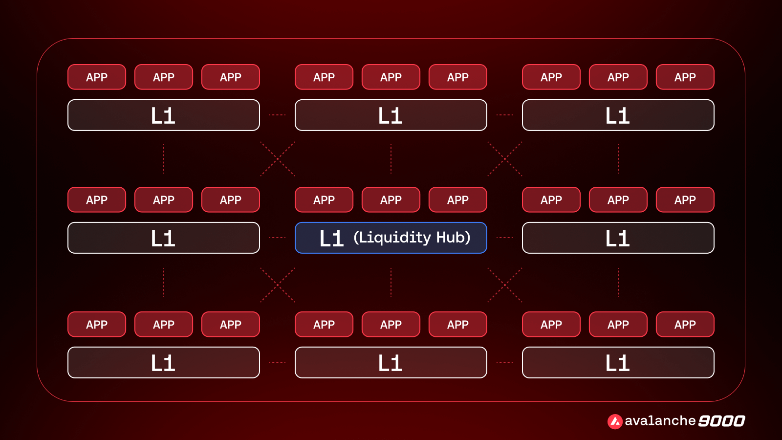프라이머리 네트워크는 이제 아발란체9000을 구동하는 경제적 허브가 됐다. 유동성은 다른 아발란체 L1s 사이에서 쉽게 흐르며, 새로운 L1s이 출시 시 즉시 프라이머리 네트워크의 경제에 접근할 수 있게 한다. 위의 그래픽은 모든 L1이 아발란체 ICM을 통해 어떻게 연결되는지 보여준다. 이 아키텍처는 (1) L1 스테이킹 경제, 가스 토큰 등을 맞춤화할 완전한 제어권, (2) 탈중앙화 증대를 위한 개방적이고 무허가 검증자 세트, (3) 지리적 제한과 맞춤 권한을 통한 내장 규제 준수, (4) 성능 최대화를 위한 모든 가상 머신으로의 확장을 가능하게 했다.