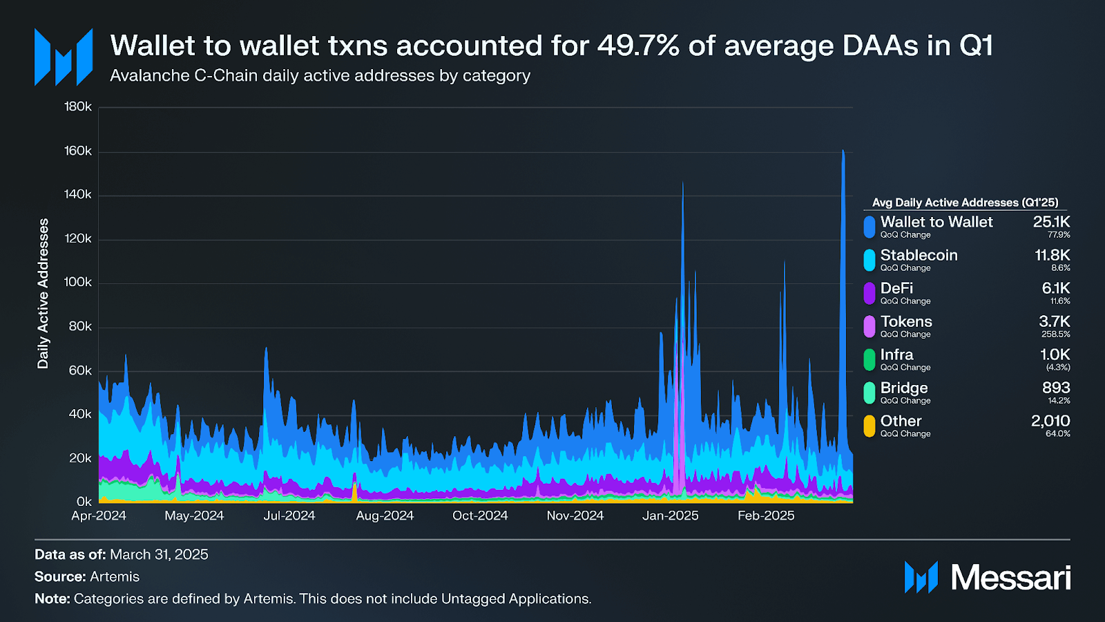 2025년 1분기에 아발란체 C-체인 일일 평균 거래량은 전분기 대비 50.4% 증가해 238,000건에서 358,100건으로 늘었다. 지갑 간 거래와 토큰 관련 거래가 C-체인 일일 거래량 증가의 가장 큰 수혜자였다.