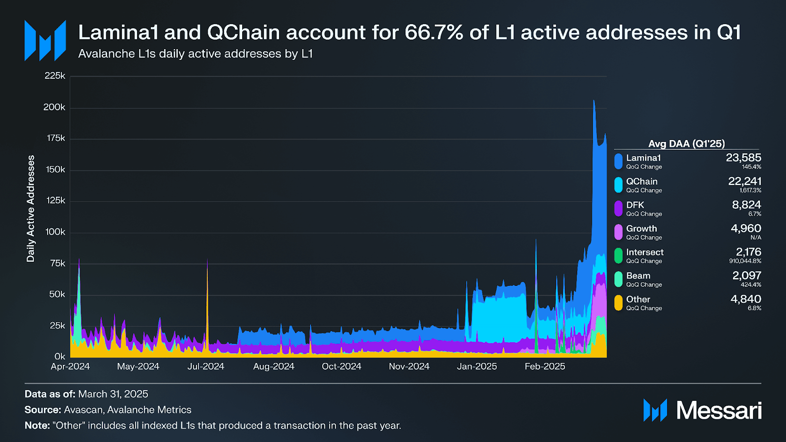 각 개별 아발란체 L1s의 일일 활성 주소(DAA)는 2025년 1분기에 증가했으며, 평균 DAA가 전분기 대비 146.3% 증가해 1,225개에서 3,017개로 늘었다. 활성 주소 기준 가장 큰 L1은 디지털 콘텐츠 제작 체인인 라미나1이었다. 라미나1과 QChain이 1분기 전체 활성 주소의 66.7%를 차지했다.