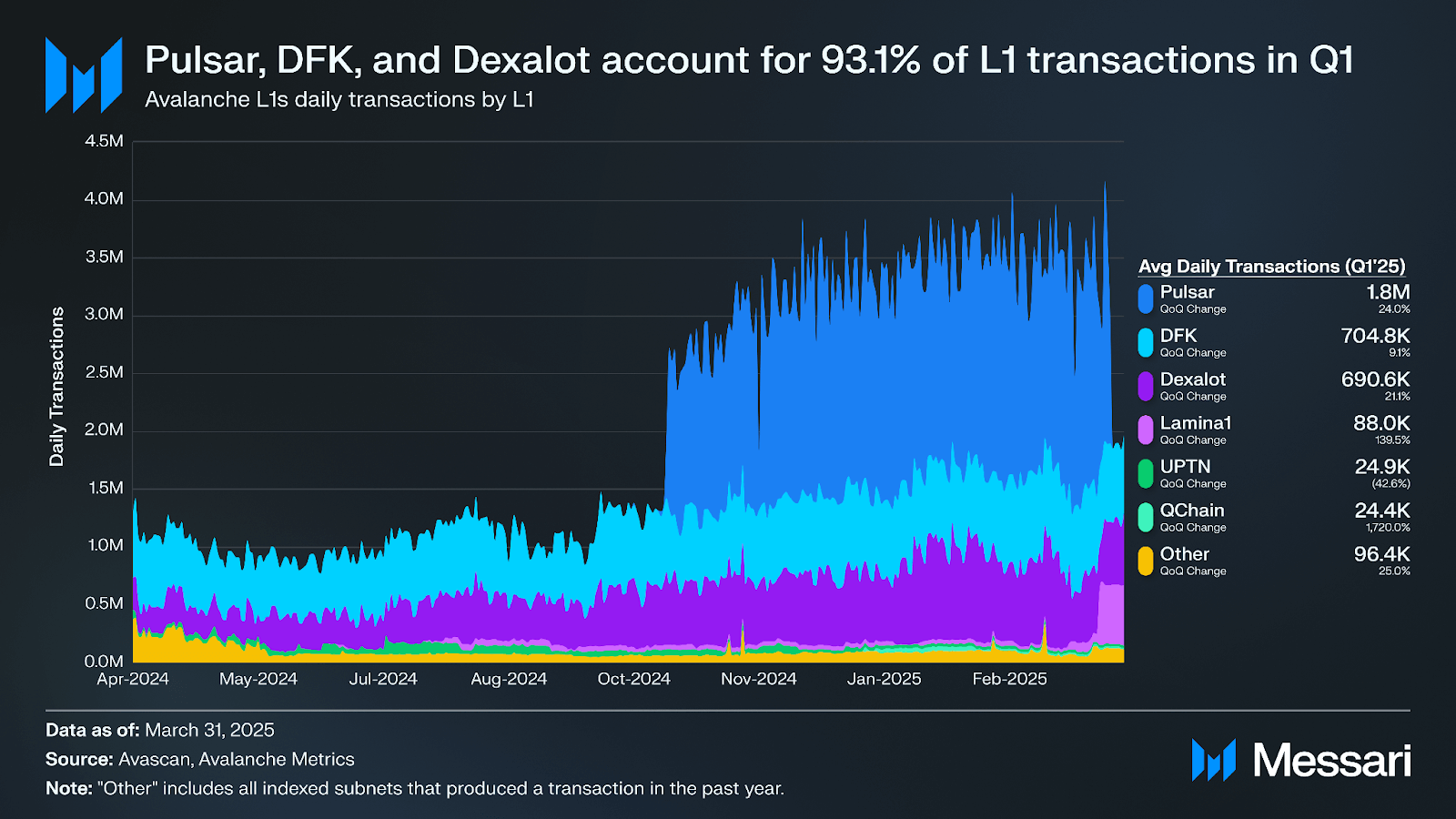2025년 1분기 대부분의 아발란체 L1s에서 거래 활동이 증가했다. 모든 L1s 전체의 일일 평균 거래량은 340만 건으로 전분기 대비 21.3% 증가했으며, 이는 280만 건에서 늘어난 것이다. 단연 가장 큰 증가세를 보인 것은 QChain으로, 전분기 대비 1,720% 증가해 일일 평균 거래량 24,400건을 기록했다. QChain은 실시간 규정 준수 로열티 결제를 위해 설계된 체인인 큐보이드(Quboid)의 L1이다. 그러나 펄사가 여전히 선두를 유지했으며, 1분기 일일 평균 거래량 180만 건으로 전분기 대비 24% 증가했다. 펄사는 2024년 3분기 말에 출시된 새로운 대규모 멀티플레이어 온라인 실시간 전략(MMORTS) 게임이다. 라미나1도 주목할 만한 증가세를 보였으며, 전분기 대비 139.5% 증가해 88,000건을 기록했다.