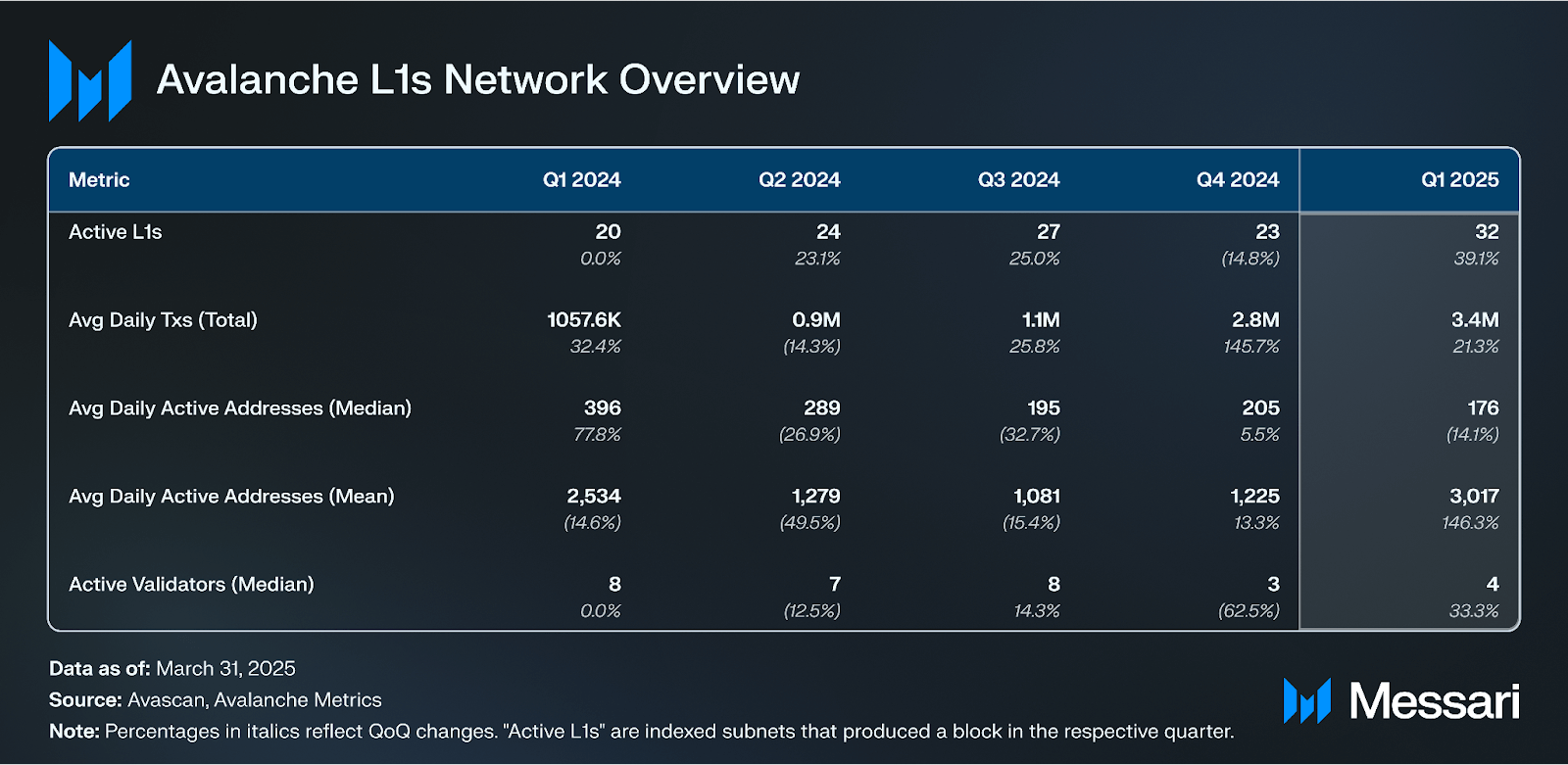 2025년 1분기에 블록을 생성한 인덱싱된 아발란체 L1s은 32개였다: