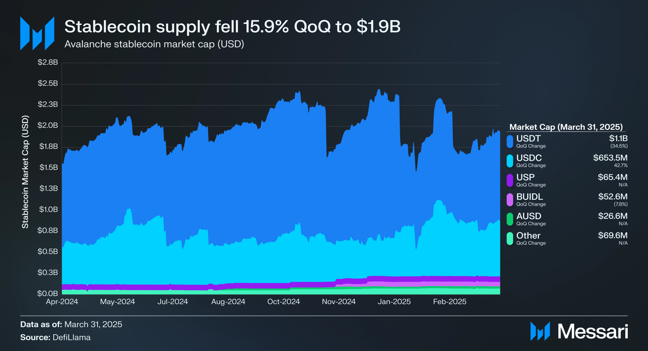아발란체 C-체인의 스테이블코인 시가총액은 2025년 1분기 말까지 19억 달러로 전분기 대비 15.9% 감소했으며, 이는 23억 달러에서 줄어든 것이다. 다른 네트워크와 비교했을 때 아발란체는 9번째로 큰 스테이블코인 시가총액을 보유했다. USDT와 USDC 같은 법정화폐 담보 스테이블코인이 아발란체 스테이블코인 공급량의 88.9%를 차지했다. USDT는 전분기 대비 34.5% 감소해 11억 달러(아발란체 스테이블코인의 55.1%)를 기록했으며, USDC는 전분기 대비 42.7% 증가해 6억 5350만 달러(아발란체 스테이블코인의 33.8%)를 기록했다.
