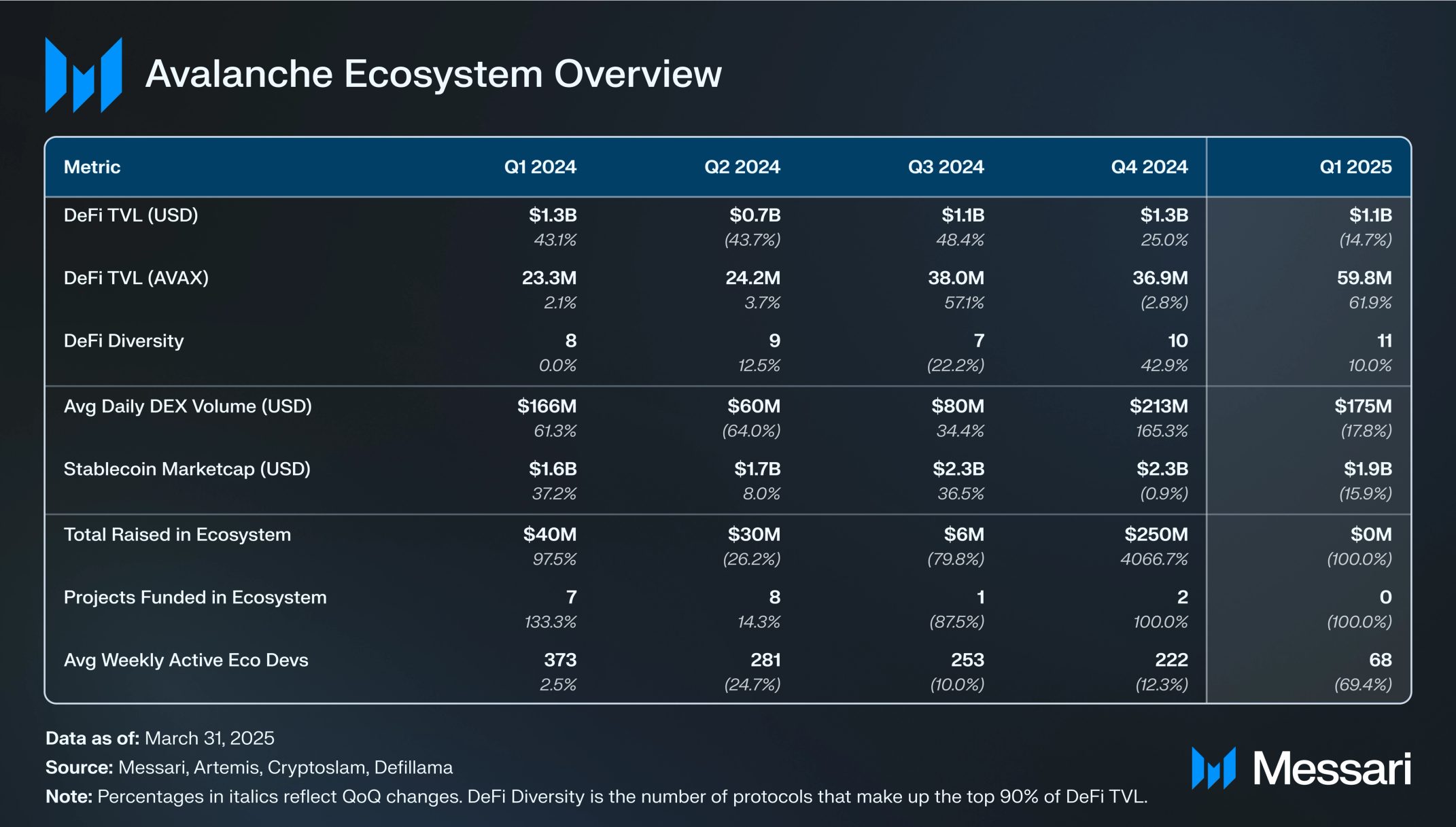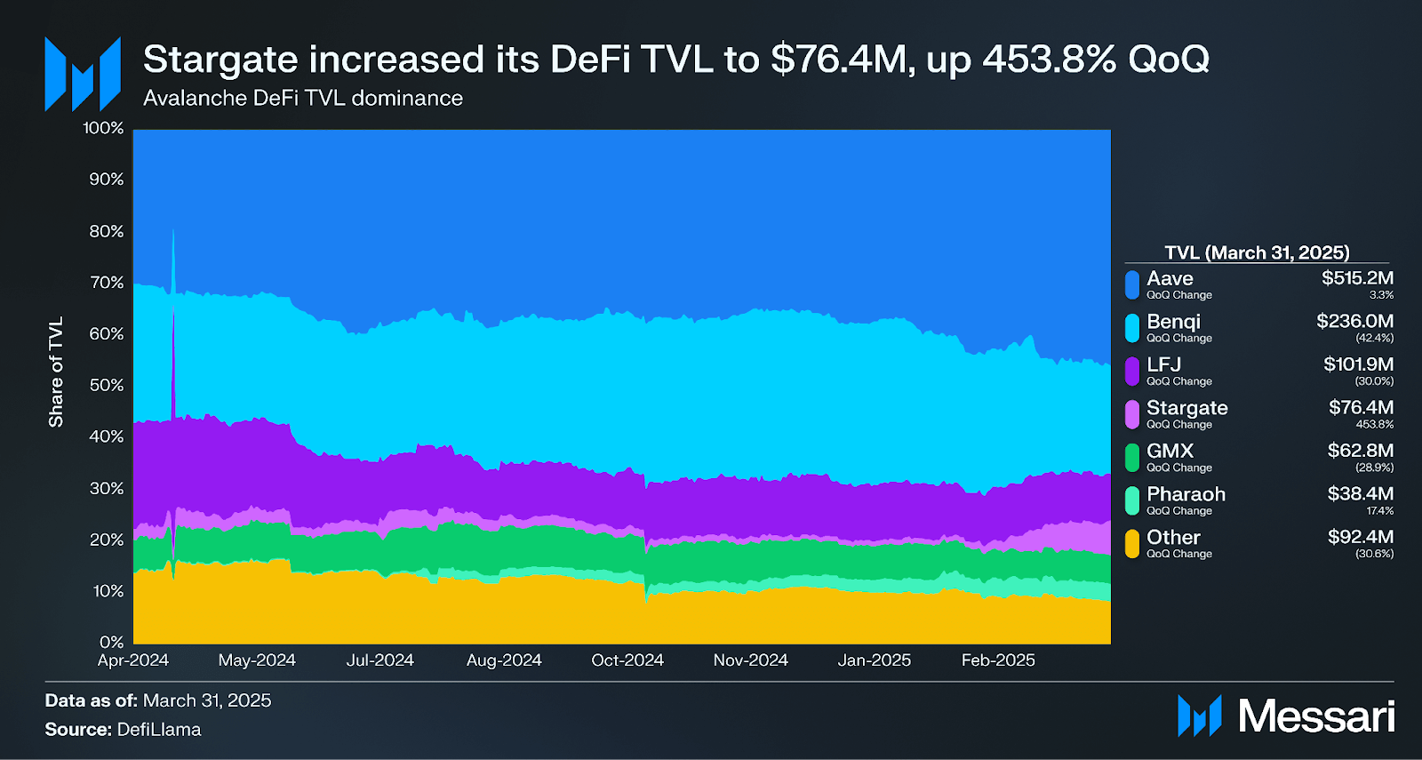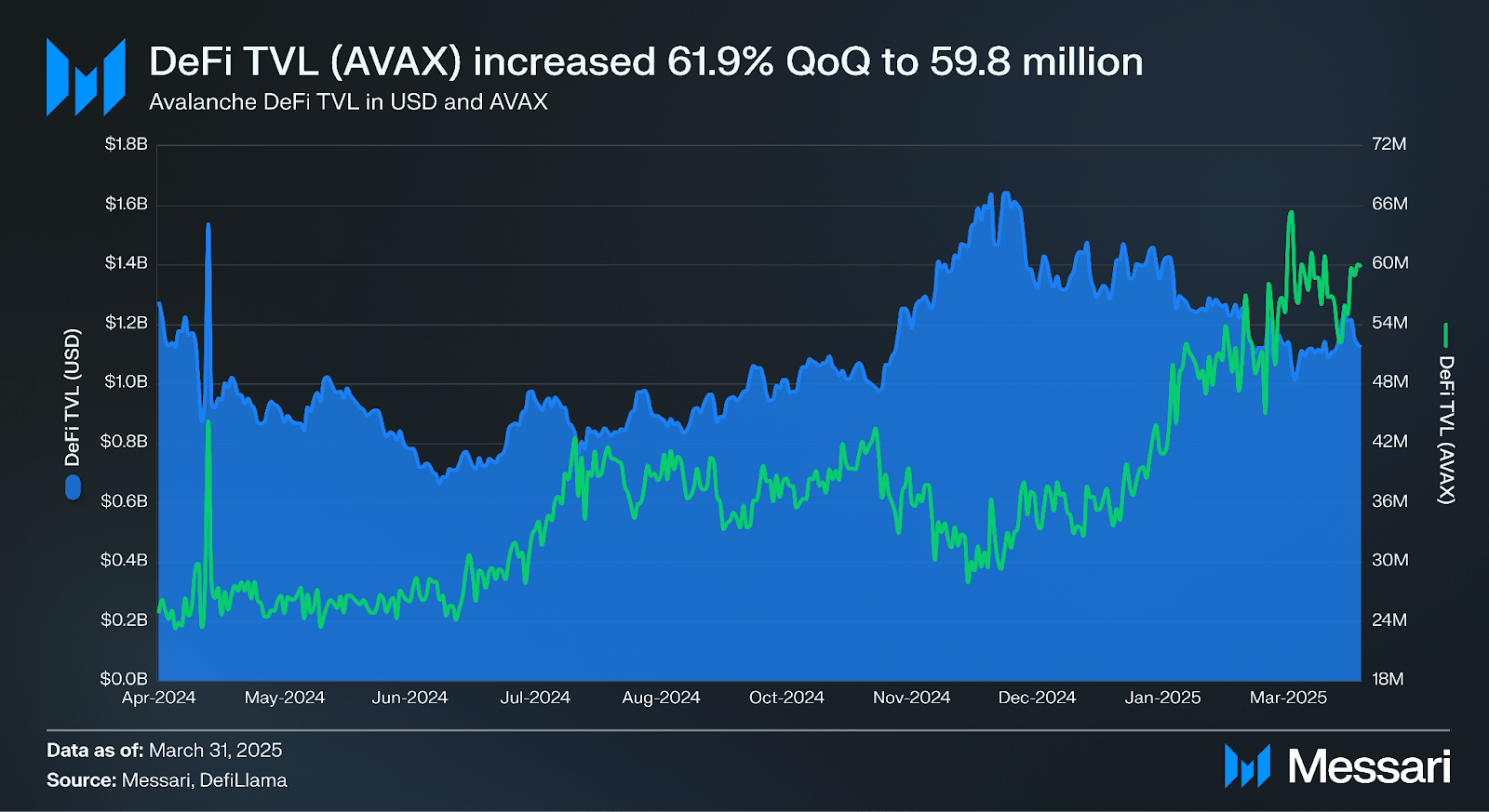 아발란체 C-체인 디파이 TVL(USD)은 2025년 1분기에 13억 달러에서 11억 달러로 감소했으며, 이는 전분기 대비 14.7% 감소했다. 분기 말까지 아발란체는 TVL(USD) 기준으로 10위 체인을 기록했다. TVL(AVAX)은 전분기 대비 61.9% 증가해 3690만 개에서 5980만 개로 늘었다.