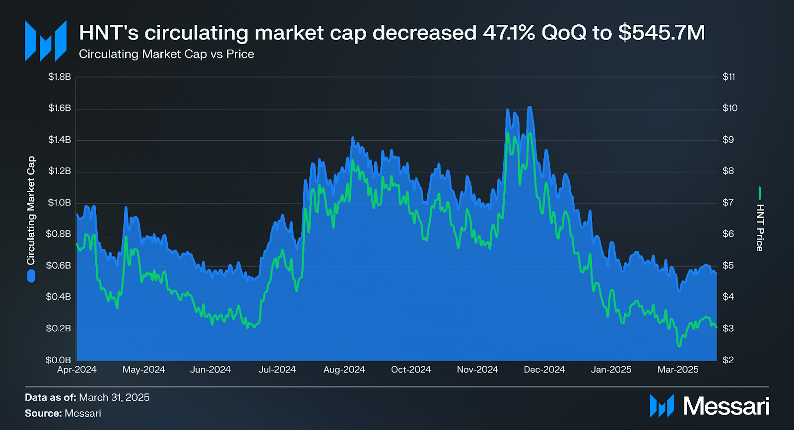 2025년 1분기 HNT의 순환 시가총액은 10억 달러에서 5억 4,570만 달러로 전분기 대비 47.1% 감소했으며, 시가총액 순위는 93위에서 96위로 하락했다. HNT 가격은 5.88달러에서 3.04달러로 48.3% 하락했다. 헬륨 네트워크 토큰(HNT)은 네트워크의 주요 토큰이다. 이는 헬륨 다오(DAO)에서 인플레이션 방출을 통해 발행되어 분배되며, 성과와 참여도(즉, 유틸리티 스코어)에 따라 서브다오에 분배된다. HNT의 주요 기능은 두 가지다: