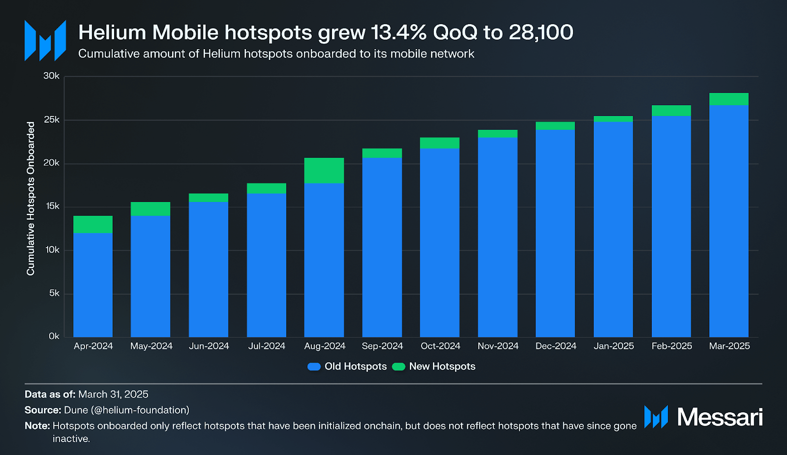 IoT 핫스팟은 전분기 대비 4.7% 증가했으며, 2023년 4월 솔라나 이전 이후 온보딩된 핫스팟 34,500개로 2025년 1분기를 마감했다. 이전 전 헬륨은 342,000개 이상의 활성 핫스팟을 보유했으며, 네트워크 총계는 376,500개를 넘는다.