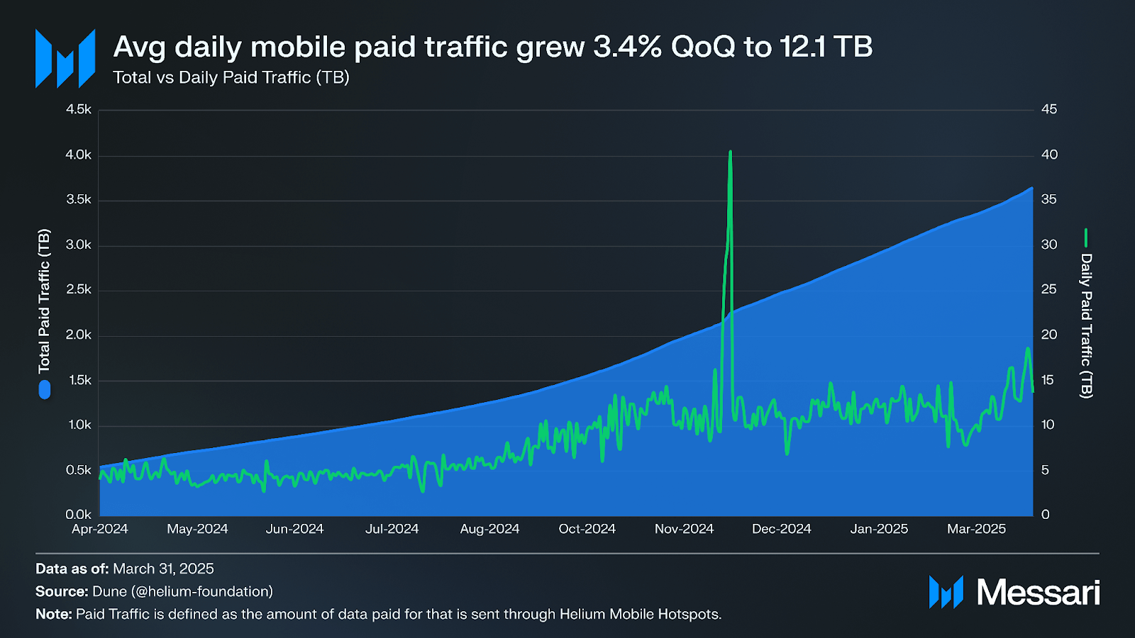 유료 트래픽은 헬륨 모바일 핫스팟을 통해 전송되는 유료 데이터의 양이다. 2025년 1분기 일일 평균 모바일 유료 트래픽은 11.7TB에서 12.1TB로 전분기 대비 3.4% 증가했다. 이 성장으로 누적 전체 유료 트래픽은 핫스팟을 통해 전송된 데이터 3,644.3TB에 달했으며, 이는 전분기 대비 42.5% 증가한 수치다. 헬륨 네트워크의 주요 수익 동력 중 하나로서, 더 많은 사용자가 네트워크에 참여하고 통신사 오프로딩 파트너십이 확대됨에 따라 이 지표는 계속 성장할 것으로 예상된다.