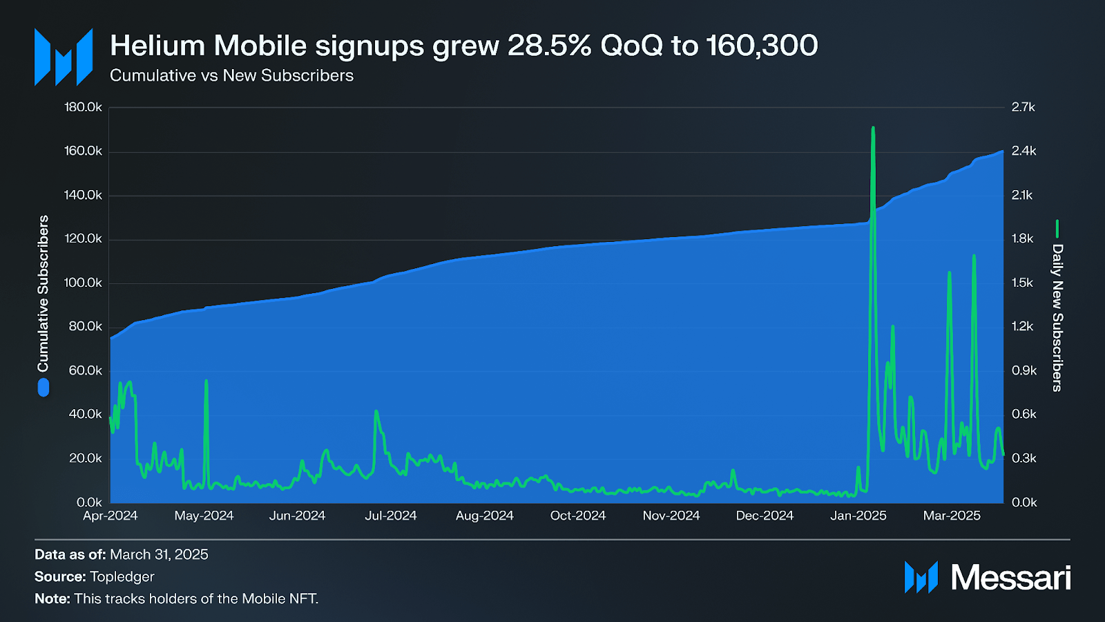 헬륨 모바일에 온보딩할 때 사용자는 지갑에 모바일 NFT를 받으며, 이는 헬륨 모바일 가입을 추적하는 데 사용된다. 1분기 계정 가입은 124,800개에서 160,300개로 전분기 대비 28.5% 증가했다.