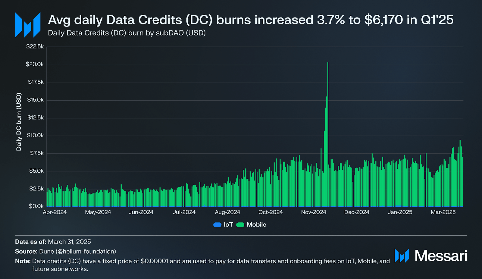 데이터 크레딧(DC)은 0.00001달러의 고정 가격을 가지며, IoT, 모바일 및 미래 서브네트워크에서 데이터 전송과 온보딩 수수료를 지불하는 데 사용된다. 2025년 1분기 총 DC 소각액은 220만 달러였다. 일일 평균 DC 소각액은 5,950달러에서 6,170달러로 전분기 대비 3.7% 증가했다. 일일 DC 소각액 중 6,043달러는 모바일 서브다오에서 나왔으며, 이는 분기 DC 소각액의 97.9%를 차지하고, 126.68달러는 IoT 서브다오에서 나왔다.