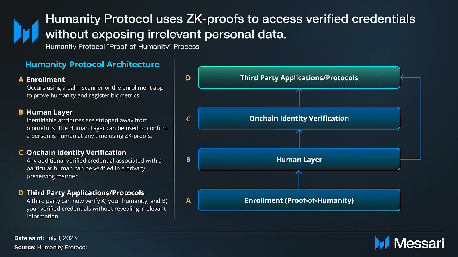휴머니티의 인간 증명 프로토콜은 손바닥 스캐너나 모바일 앱을 사용하여 인간을 등록하고 확인한다. 사용자의 손바닥을 스캔한 후 프로토콜은 역공학이나 원본 이미지와 연결이 불가능한 암호화 증명을 생성하여 생체 데이터가 저장되지 않고 사용자가 신원 제어권을 유지한다. 생체 데이터를 저장하는 대신 시스템은 휴먼 ID와 연결된 해시를 생성하며, 이는 사용자가 특정 지식을 보유하고 있음을 증명할 수 있는 암호학적 방법인 영지식 증명을 사용하여 확인할 수 있다. 사용자는 문서나 생체 이미지를 공개하지 않고도 생존성, 심지어 나이나 거주지 같은 개별 특성을 증명할 수 있다. 사용자는 모바일 기기의 손바닥 표면 지문이나 손바닥 스캐너의 적외선 정맥 스캔을 사용하여 재확인하여 검증된 자격 증명을 확인한다.