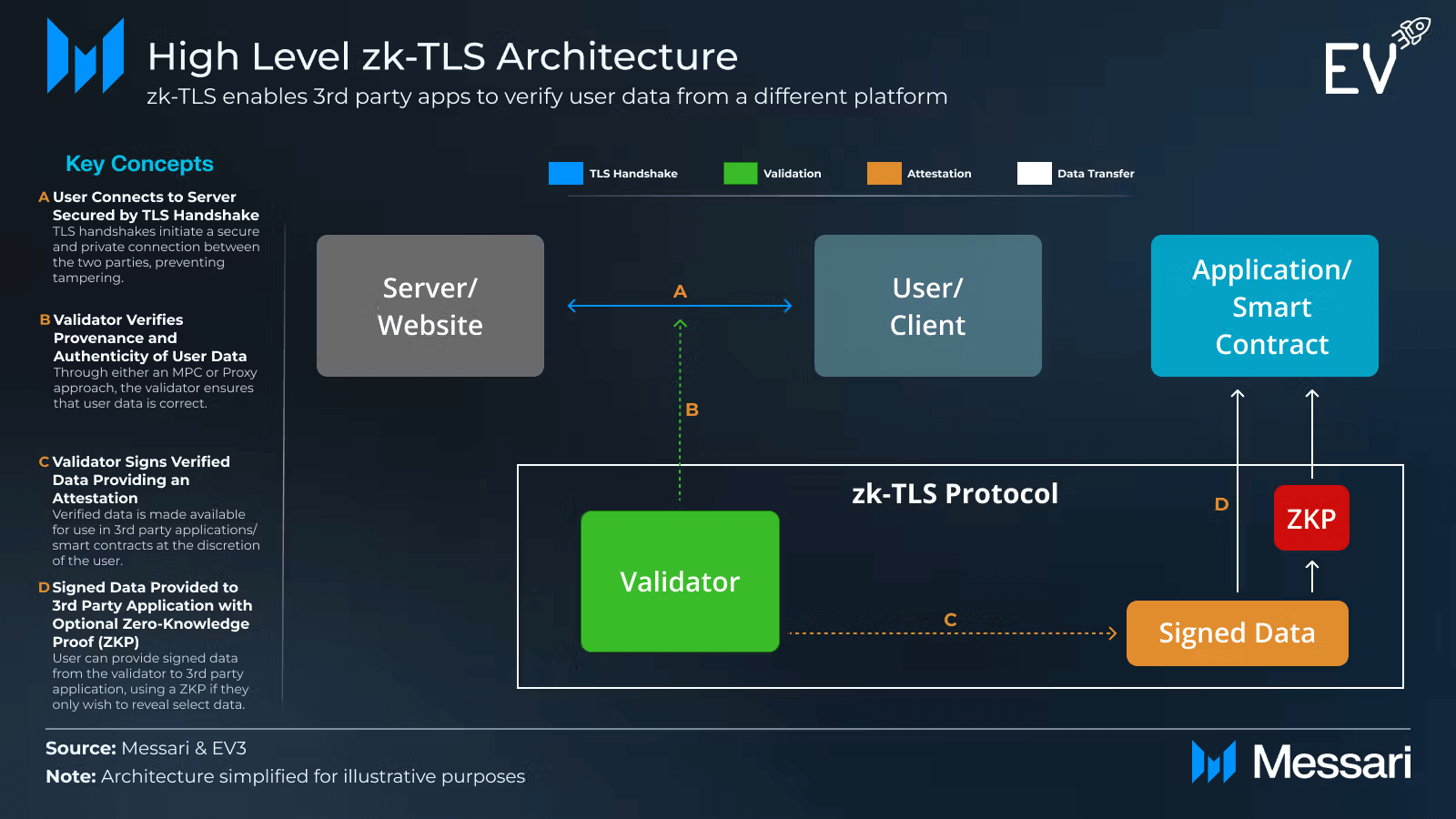 휴머니티 프로토콜의 ZK-TLS 프레임워크는 이 모델을 암호화 증명으로 대체한다. 문서를 업로드하는 대신 사용자는 기본 데이터를 공개하지 않고도 인간 확인이나 지리적 적격성과 같은 특정 신원 특성을 증명할 수 있다. ZK-TLS는 사용자와 서버 간의 TLS 핸드셰이크(두 당사자가 인터넷을 통해 서로를 인증하고 데이터 전송을 위한 보안 채널을 설정할 수 있게 함)를 캡처하여 검증자가 원시 데이터를 노출하지 않고도 나이나 거주지와 같은 속성을 확인할 수 있게 한다. 검증자는 검증된 데이터에 서명하고, 사용자는 이를 영지식 증명으로 변환하여 애플리케이션에 제출할 수 있다. 이를 통해 제3자가 기본 정보에 액세스하지 않고도 신원 특성을 확인할 수 있다.