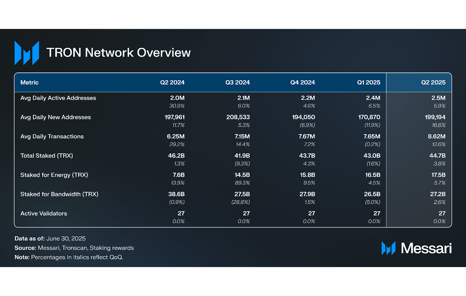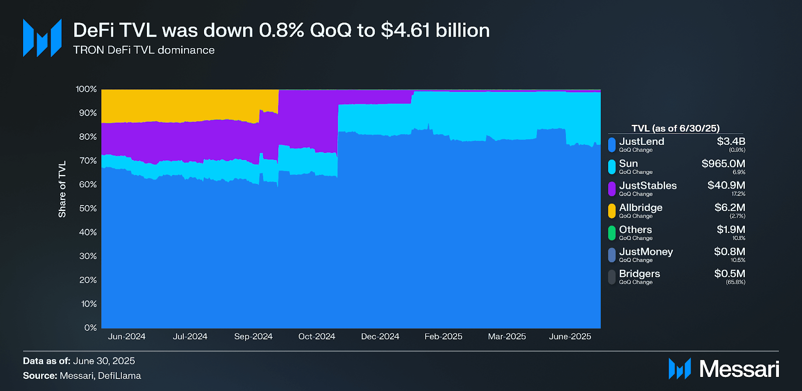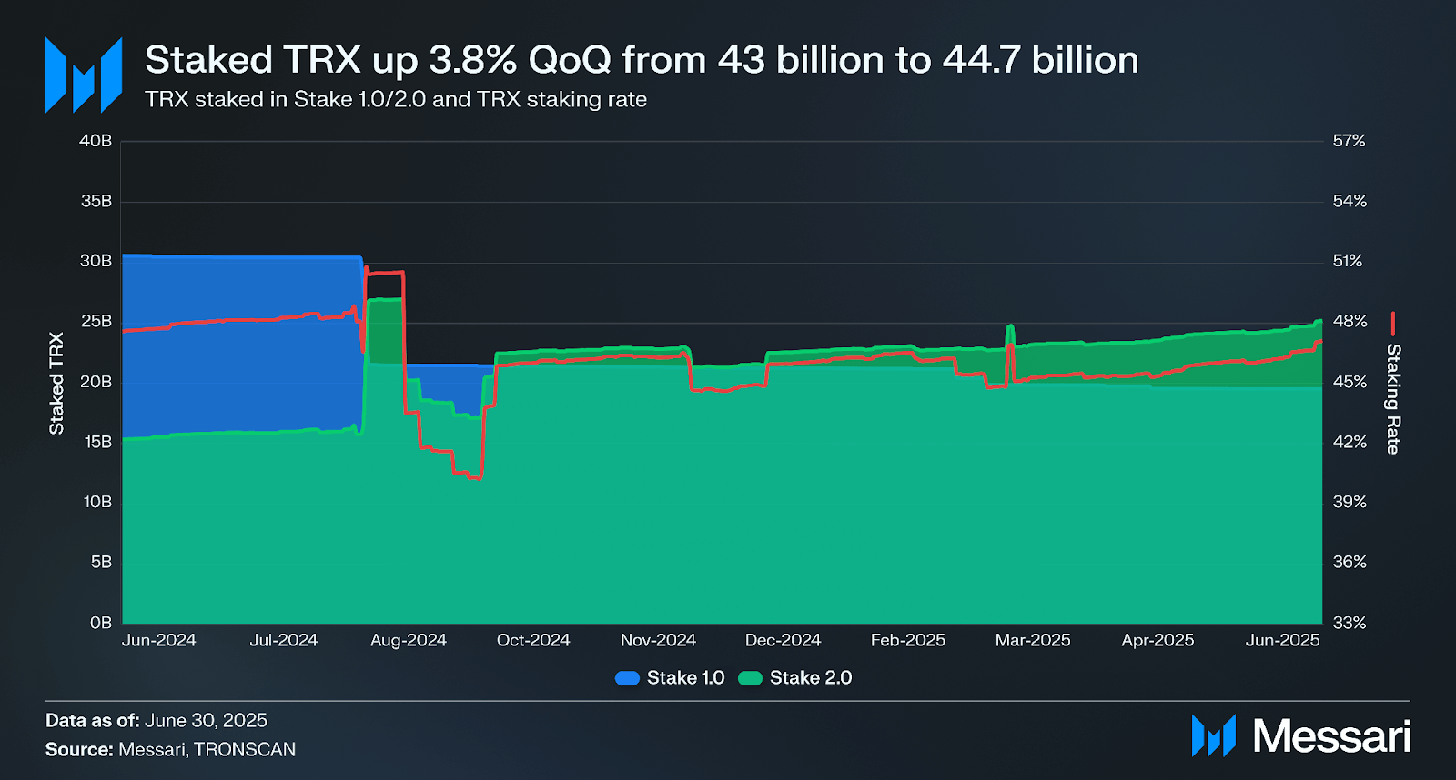 2025년 2분기에 트론은 시가총액, 총 수익, 생태계 참여의 지속적인 증가와 함께 주요 지표에서 꾸준한 성장을 유지했다. 네트워크는 2분기에 계속 디플레이션을 유지했으며 스테이블코인 우위, 디파이 활동, 향상된 인프라의 지원을 받아 또 다른 강력한 분기를 전달했다. 스테이블코인 활동은 트론 생태계의 핵심 기둥으로 계속 남았다. USDT가 스테이블코인 공급량의 99.2% 점유율을 유지했고 일일 평균 전송량이 전분기 대비 11.6% 증가해 213억 달러에 달했다. 디파이 사용은 저스트랜드와 SUN 같은 프로토콜에 집중된 상태로 남았고, 트론의 스테이킹 비율은 스테이크 2.0의 광범위한 채택 가운데 47.1%로 증가했다. 에스알엠 엔터테인먼트, 프리비, 브리지(스트라이프 계열사), 에이온 페이와의 통합, 그리고 트론에서의 USD1 출시를 통해 생태계 확장이 가속화되었다. 지속적인 기술 업그레이드와 증가하는 네트워크 사용량과 함께 트론은 스테이블코인과 온체인 금융 환경에서 선도적인 세력으로 남아있다.