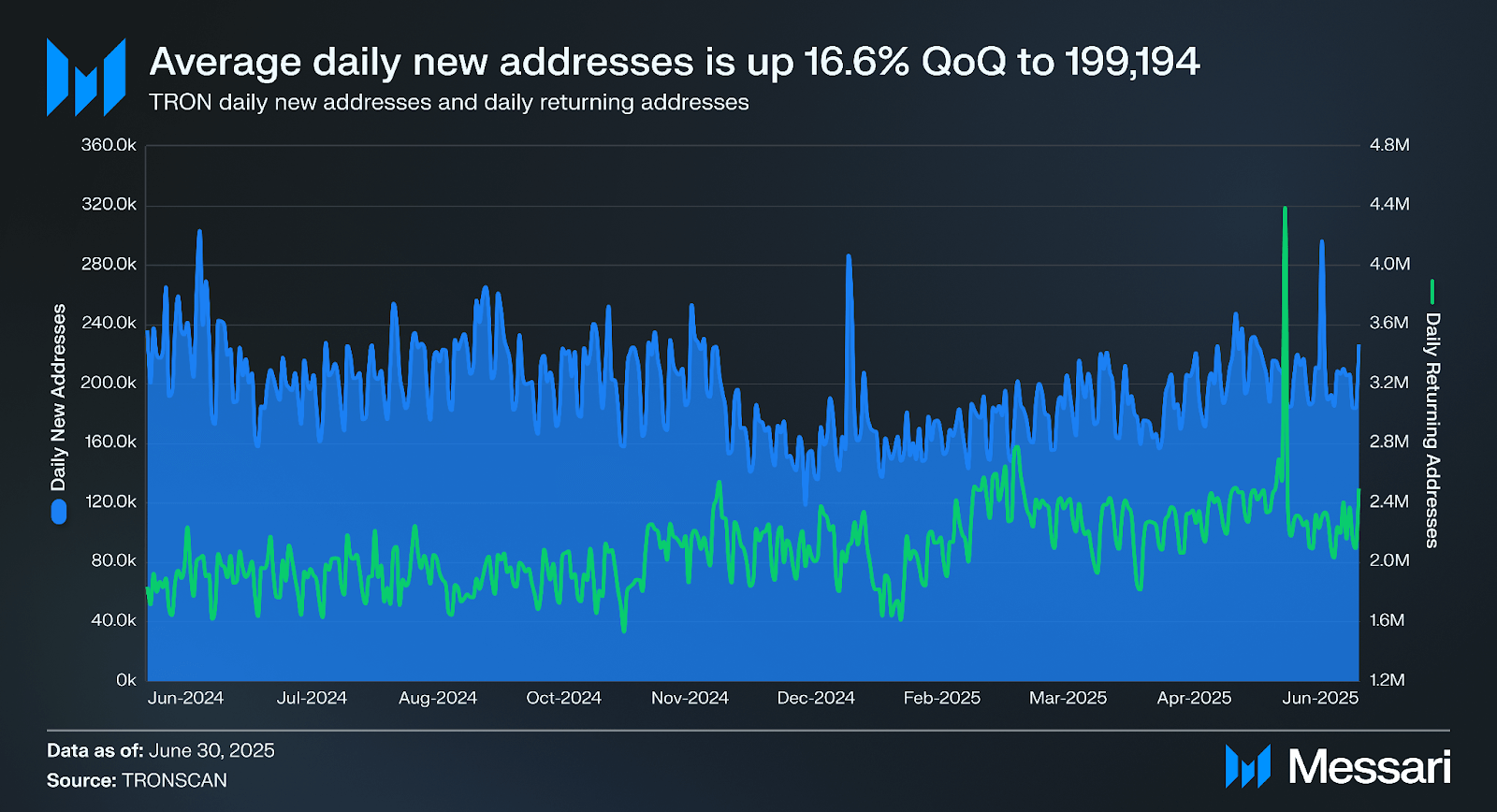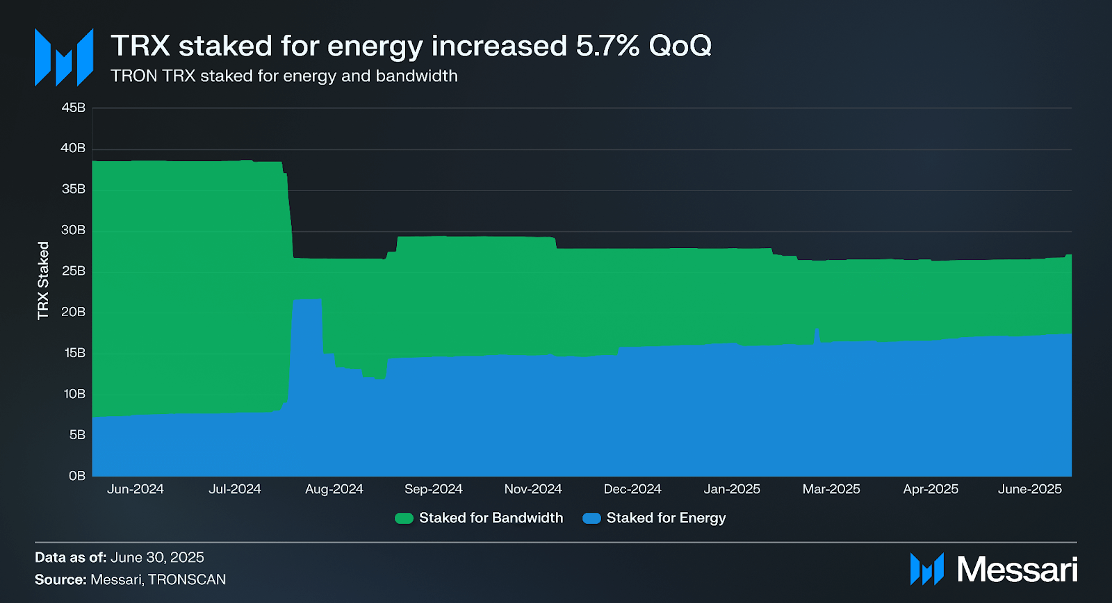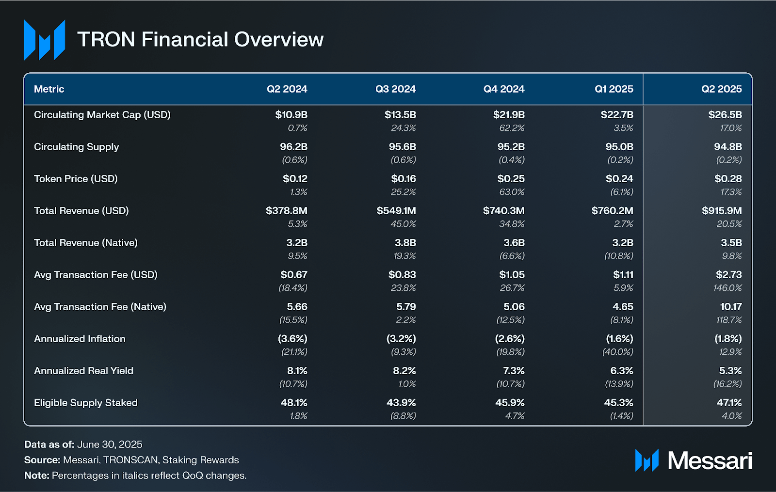 2025년 2분기에 트론은 시가총액, 총 수익, 생태계 참여의 지속적인 증가와 함께 주요 지표에서 꾸준한 성장을 유지했다. 네트워크는 2분기에 계속 디플레이션을 유지했으며 스테이블코인 우위, 디파이 활동, 향상된 인프라의 지원을 받아 또 다른 강력한 분기를 전달했다. 스테이블코인 활동은 트론 생태계의 핵심 기둥으로 계속 남았다. USDT가 스테이블코인 공급량의 99.2% 점유율을 유지했고 일일 평균 전송량이 전분기 대비 11.6% 증가해 213억 달러에 달했다. 디파이 사용은 저스트랜드와 SUN 같은 프로토콜에 집중된 상태로 남았고, 트론의 스테이킹 비율은 스테이크 2.0의 광범위한 채택 가운데 47.1%로 증가했다. 에스알엠 엔터테인먼트, 프리비, 브리지(스트라이프 계열사), 에이온 페이와의 통합, 그리고 트론에서의 USD1 출시를 통해 생태계 확장이 가속화되었다. 지속적인 기술 업그레이드와 증가하는 네트워크 사용량과 함께 트론은 스테이블코인과 온체인 금융 환경에서 선도적인 세력으로 남아있다.