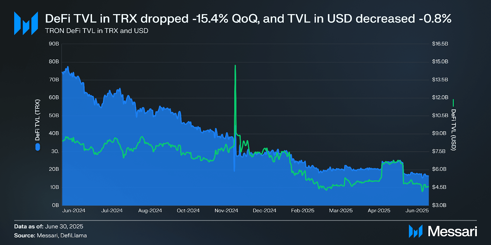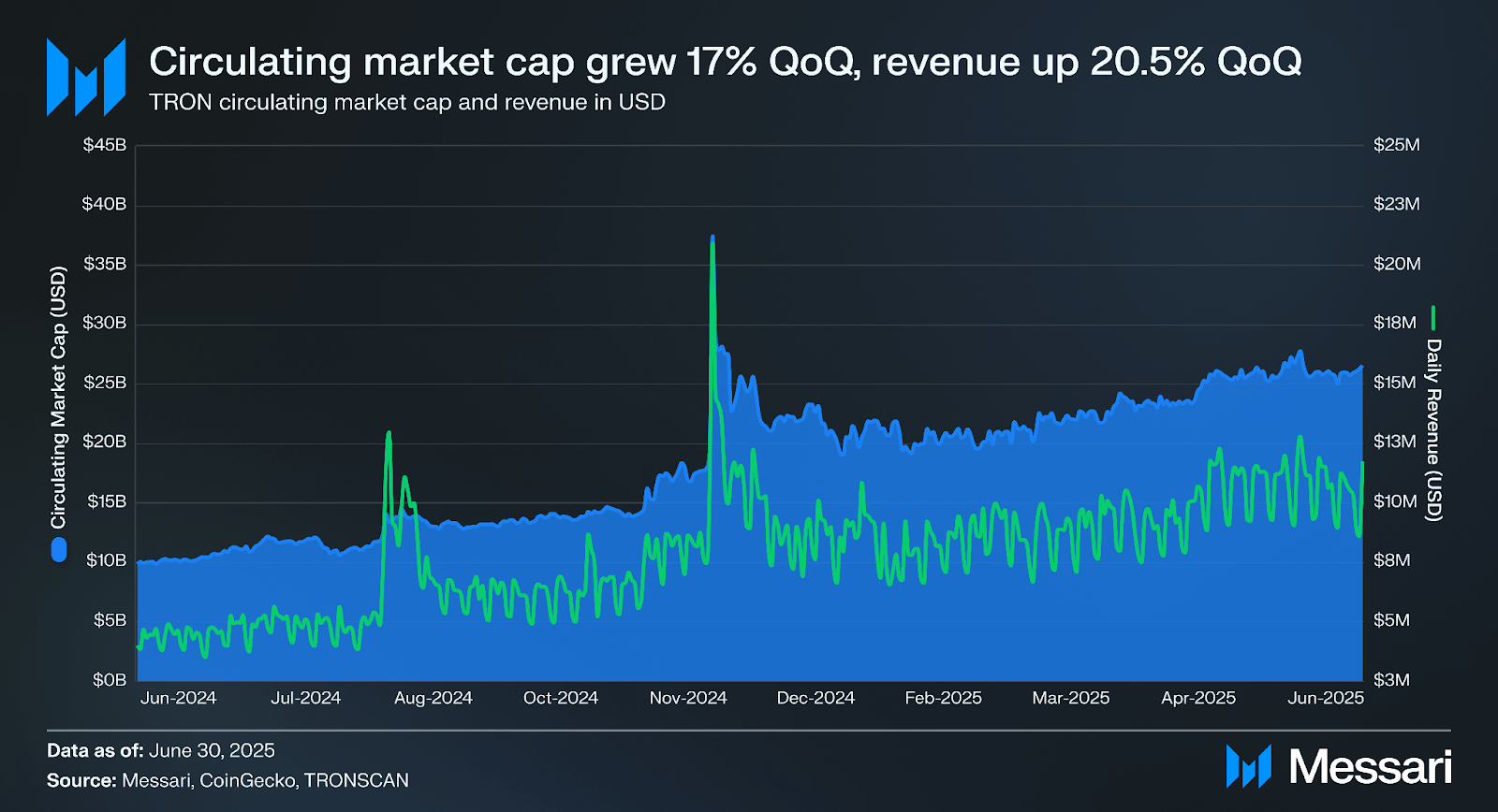 • 트론(TRON)은 2분기 주요 지표에서 성장을 경험했다. 시가총액이 전분기 대비 17% 증가해 265억 달러를 기록했고, 수익은 전분기 대비 20.5% 증가해 9억 1,590만 달러를 달성하며 모두 여러 분기 최고치를 경신했다.
