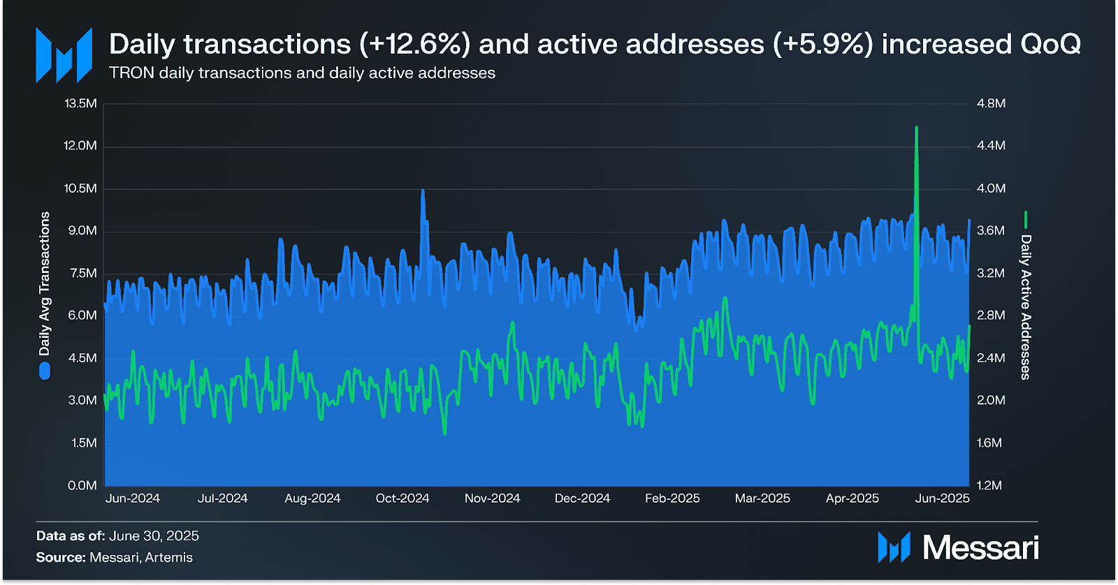 2분기 트론 사용량은 긍정적이었다. 일일 거래량과 일일 활성 주소 같은 온체인 활동 지표가 증가했다. 일일 평균 거래량은 전분기 대비 12.6% 증가해 770만 건에서 860만 건으로 늘었고, 일일 활성 주소는 전분기 대비 5.9% 증가해 240만 개에서 250만 개로 증가했다.