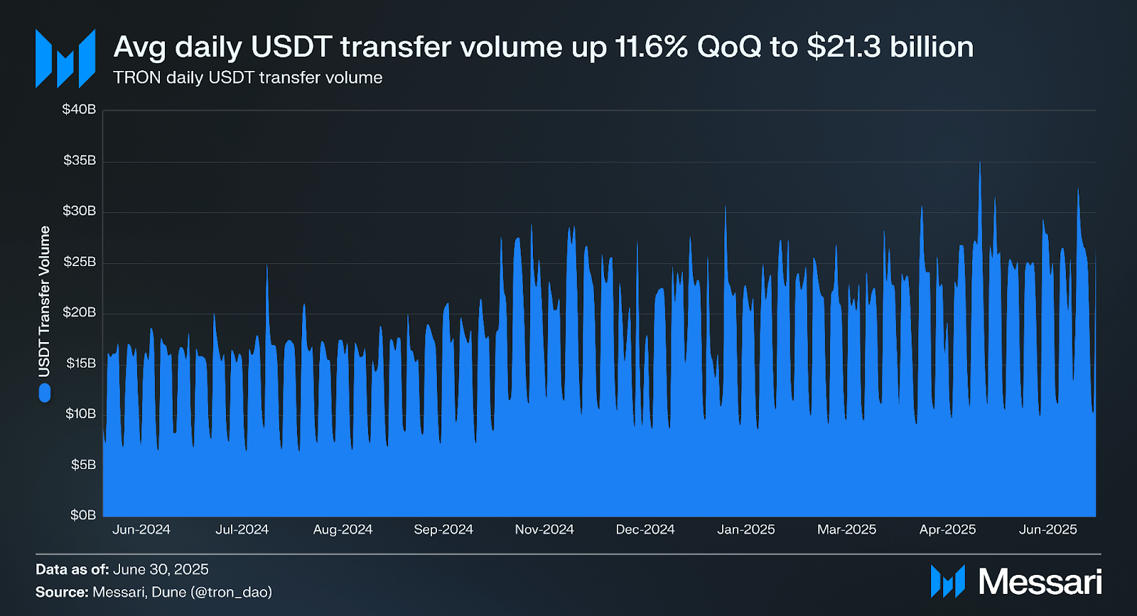 • 스테이블코인 사용이 네트워크의 초석으로 남았다. USDT가 트론 스테이블코인 공급량의 99.2%를 차지했고, 시가총액이 전분기 대비 22.2% 증가해 803억 달러를 기록했다. 일일 평균 USDT 전송량은 전분기 대비 11.6% 증가해 213억 달러에 달했다.