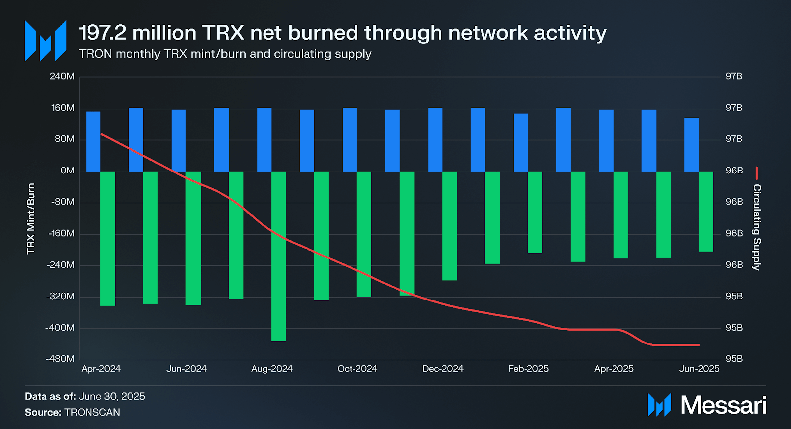 2분기에 TRX의 유통량은 950억 개에서 948억 개로 감소했다. 연환산 기준으로 이는 약 -1.8%의 인플레이션율과 같다. 연환산 인플레이션은 전분기 대비 증가해 -1.6%에서 12.9% 상승했다.
