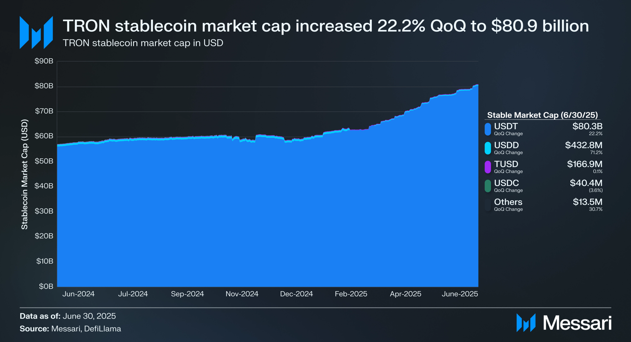 트론의 스테이블코인 시가총액은 지난 1년간 꾸준히 상승 추세를 보이며 2분기에 다시 사상 최고치를 달성했다. 스테이블코인 시가총액은 전분기 대비 22.2% 증가해 662억 달러에서 809억 달러로 늘었다. USDT는 트론 스테이블코인의 압도적 다수를 차지하며 99.2%의 시장 점유율을 자랑한다(전분기 대비 -0.1%). 트론의 USDT 시가총액은 분기를 803억 달러(전분기 대비 +22.2%)로 마감했다. 주목할 점은 유통되는 모든 USDT의 50.6%가 트론에 있다는 점이다.