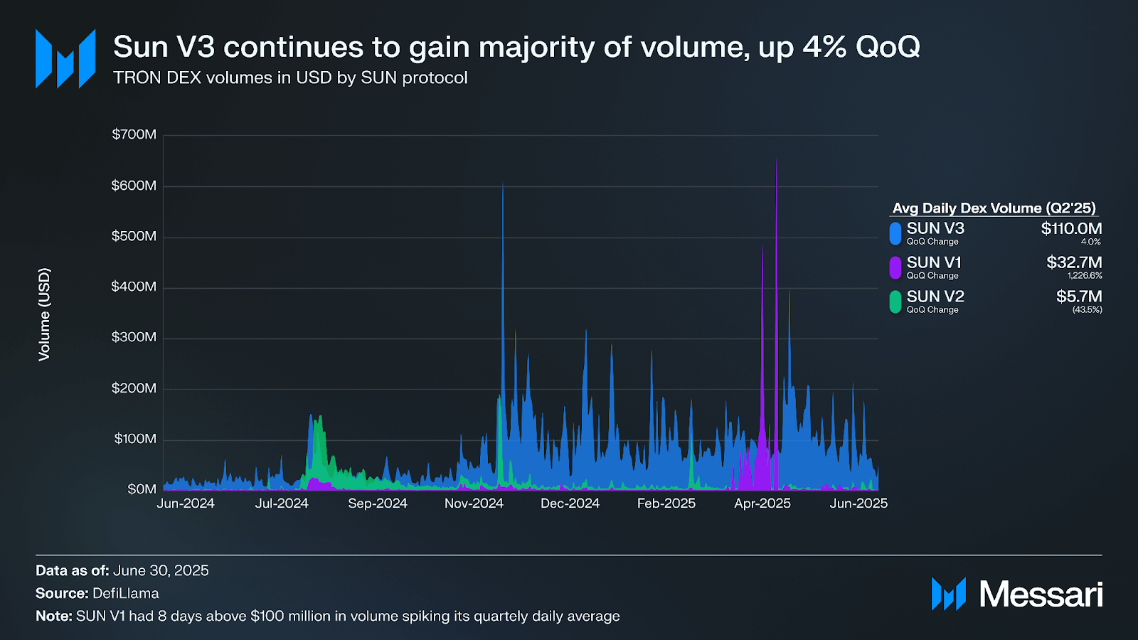 본질적으로 트론의 모든 DEX 거래량은 SUN에서 발생한다. 2023년 6월, SUN은 제품군에 집중 유동성(CL) AMM을 도입했다(썬스왑 V3, SunSwap V3). 2024년 1분기는 썬스왑 V3 도입 이후 처음으로 SUN에서 거래량의 대부분이 V3 AMM을 통해 라우팅된 시기였다. SUN V1의 거래량 급증으로 인해 SUN V3는 2025년 2분기 트론의 전체 거래량 중 74.1%를 차지했다.