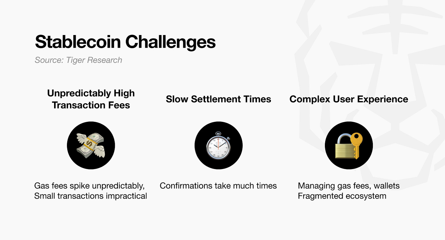 하지만 급속한 성장과 함께 구조적 문제들도 선명하게 드러나고 있다. 현재 스테이블코인 인프라는 세 가지 치명적인 제약에 직면해 있다.