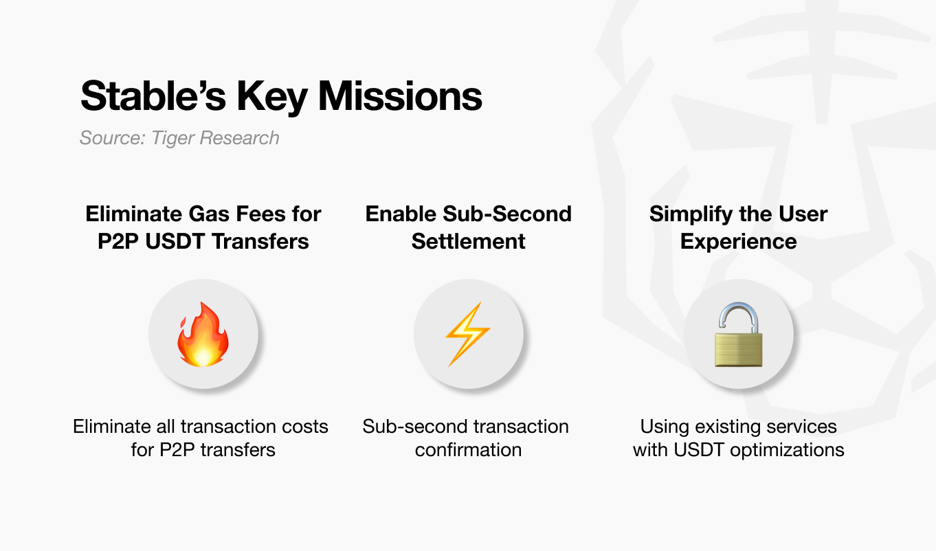즉, 각각의 체인에서 USDT를 지원했던 것과 달리, 아예 USDT만을 위한 맞춤형 고속도로를 새로 건설한 셈이다. 스테이블의 핵심 미션은 명확하다.